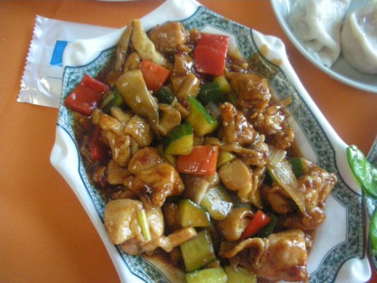 (キュウリと鶏肉の甘酢炒め。)