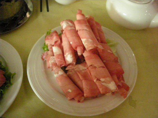 北京の火鍋は「?羊肉」とよばれ、羊肉は羊の後ろ脚のあたりの霜降り肉を厳選したものです。薬膳スープに羊肉のスライスをしゃぶしゃぶして胡麻だれをつけて食べます。たべる順番としてはまず胃袋を入れ、それから普通の肉、野菜と鍋に入れた後に最後は麺で仕上げです。