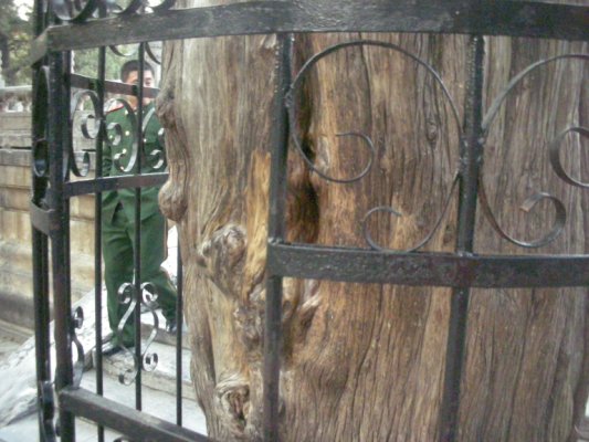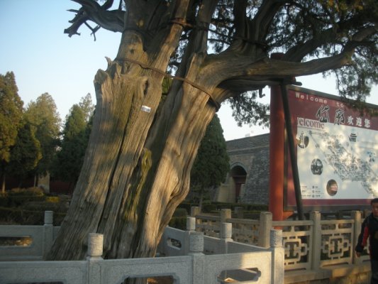 (天キョウ殿前の木。さっきの太湖石より回転して真直ぐ木の穴にいけたら運が良いとされる。)