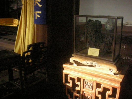 (東御座。神を祭った場所。鎮山三宝のひとつ沈香獅子。これはキャラの木でできていて、もともと獅子の形をしていた木に少し手を加えて作られている。)