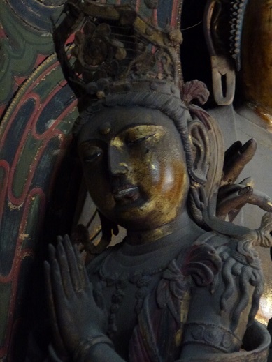 下華厳寺の釈迦仏の脇侍菩薩。上半身を少し傾け合掌し、少し歯を見せてほほ笑むことで“東洋のビィーナス”と言われています。この菩薩には伝説があり、昔、工事監督が、老いた職人の仕事が終わってないのを見つけ、職人を罰として酷く棒で打つよう命じました。その時、娘が進み出て、父の代わりに私を打てと言ったので、工事監督は、この娘の上半身を剥いて棒で打たせ、これを曝しました。刑罰の後、娘はまわりをしみじみとみてにっこりと笑い、鉄鐘を鋳込むための鉄の溶湯の中に身を躍らせました。娘は白雲となって天に昇り、監督は撥ねた鉄の溶湯をかぶって焼け死んだそうです。これを見たひとりの若い職人が、娘の生前のにっこり笑った目つきや肢体を菩薩に彫りあげたものとの伝説が残っています。