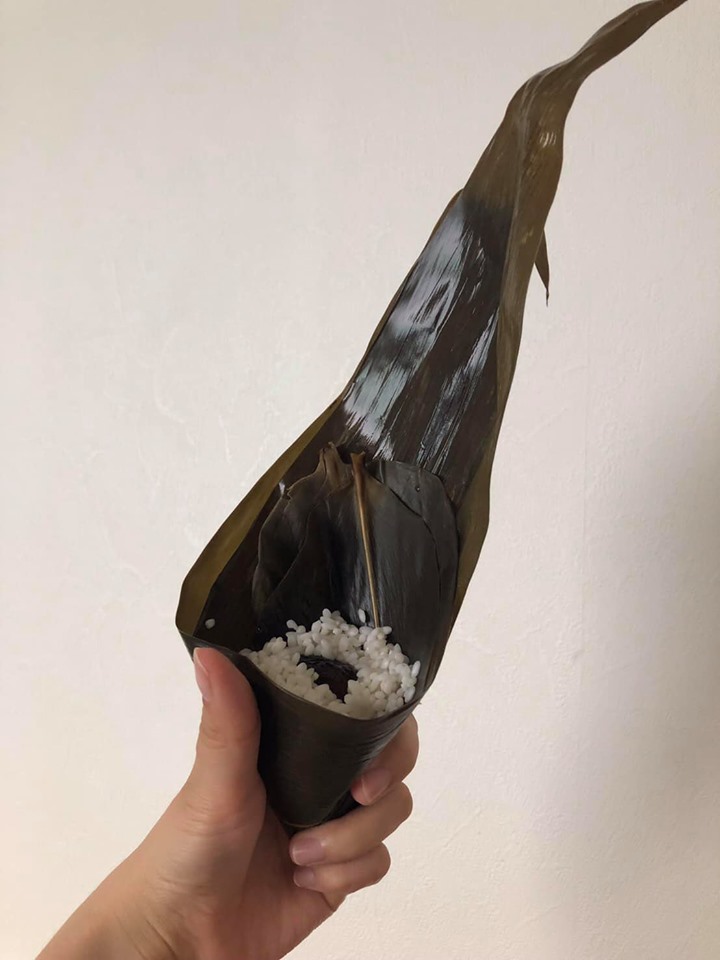 まずちまきの包み方です。2枚の葉っぱを重ね合わせ、巻いて円錐型にします。次にもち米を入れ、砂糖漬けなつめ一個とこしあんをひと塊り入れた後、またもち米を足します。次にとても長い笹の葉を折り曲げて中の餡の材料をしっかりと包み込みますが、これはちまきを作る中で一番難しいところです。最後に縄で縛り付けるのですが、私は中の餡が溢れるのが心配なので、縄の本数を増やしてあります。皆さんも心配なら増やしても構いません。