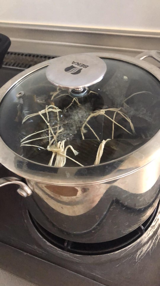縛り終えたちまきを鍋に入れ、ちまきが浸かるくらいたくさん水を入れます。火を入れて直接弱火で煮てください。一時間半後に火を消し、15分間そのまま鍋に入れておいた後、蓋を開けます。ちまきを取り出し、冷たい水に浸け、何度か水を変え、ちまきが完全に冷えたら出来上がりです。