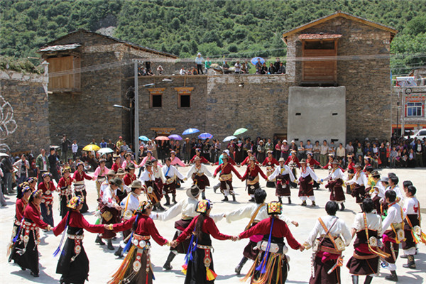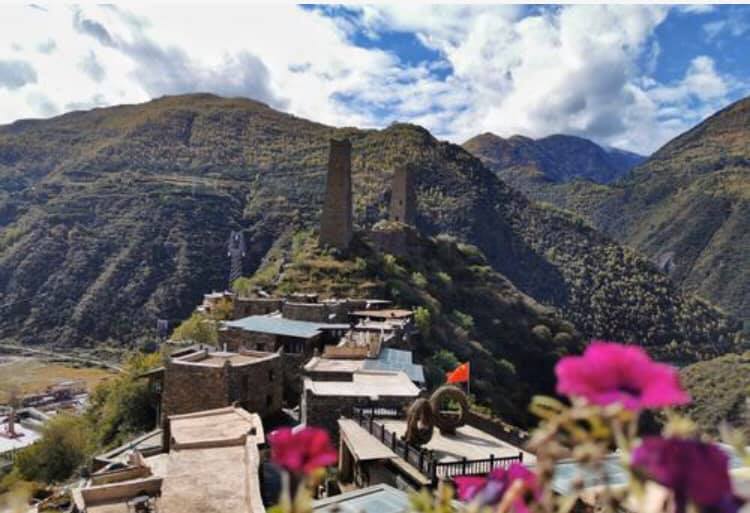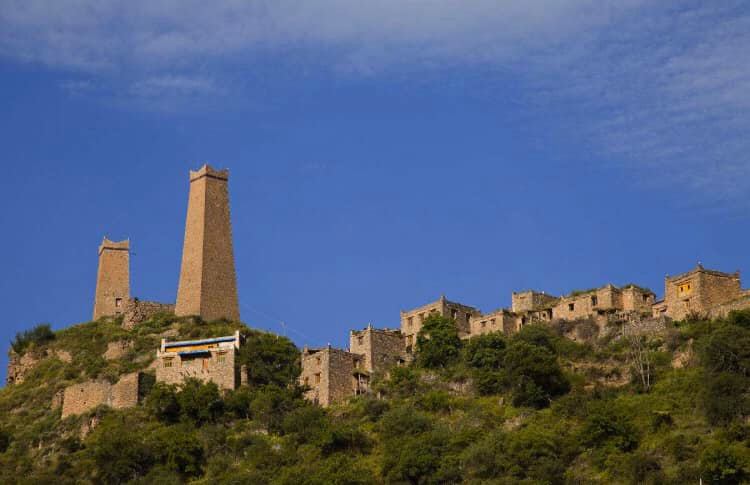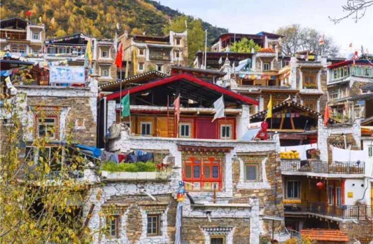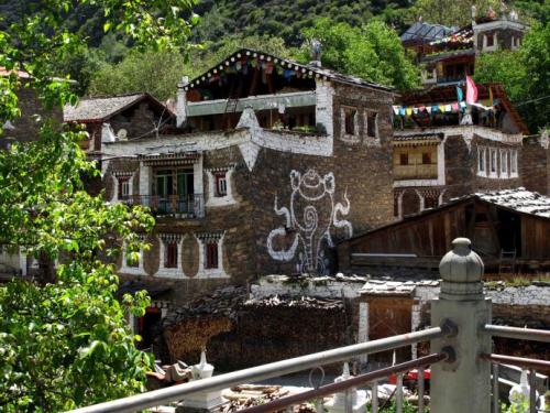 成都方面の手前、卓克基にある土司官寨や西索民居は煉瓦造りの建物が美しく、壁が白い漆喰で綺麗に塗り固められ、窓枠が赤で塗られている石造りの家が立ち並んでいます。またシンプルな石造りで窓が白で塗られているものもあります。特に点在する約30mもある、八角形の見張り台の塔はこの地方独特のものです。