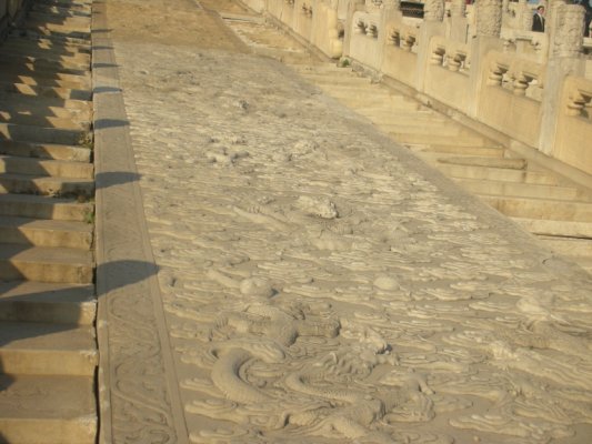 (大和門の皇帝が通る階段。龍の彫刻。)
