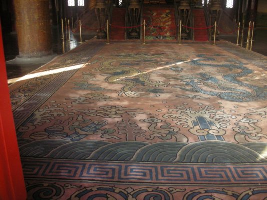 (映画「ラストエンペラ」のラストシーンの中に、平民となった溥儀が故宮に観光に訪れ、そこで出会った男の子に宝座の後ろに隠してあったコウロギを見せるという場面がありましたね。玉座の上には大きな玉が吊るされており、皇帝以外や皇帝に適さない人物が座ると落下し、頭をかち割るという言い伝えがあります。辛亥革命後の1916年に「皇帝」を自称した袁世凱は、この言い伝えを恐れてわざと玉座をずらして座っていたようです。)