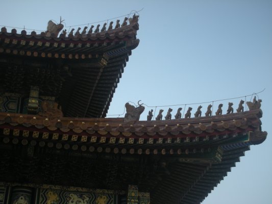 (太和殿の走獣。右から騎鳳仙人、麒麟、鳳凰、獅子、海馬、天馬、押魚、サン猊、カイ豸、斗牛、行什、旁吻。中国の明清時代の建物(宮殿や寺院)の屋根には「走獣」という魔除けの飾りがついています。先頭は「騎鳳仙人(鳳凰に跨った仙人)」で、その後に龍や麒麟など想像上の動物が続きます。そして最後は火よけの意味をなす「旁吻(口を開けた魚)」という構造です。仙人と旁吻の間の動物の数は建物の格式が高くなるほど増えていきます。そして、中国で一番数が多いのが紫禁城・太和殿の10匹(仙人、旁吻を含まず)です。)