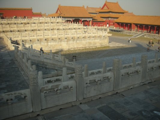 (太和殿、中和殿、保和殿は、白大理石の三重の基台の上に建てられていますが、中和殿の両サイド(西側と東側)には、基台から降りる階段があります。東側(中和殿に向かって右側)にある階段を下りたところが、テニスコートがあった場所のようです。映画「ラストエンペラ」では、家庭教師や皇后たちとテニスを楽しんでいたところに、突然、大勢の軍人がやってきて、「1時間以内に紫禁城から出て行くように!」と言い渡されるシーンのロケ地です。)