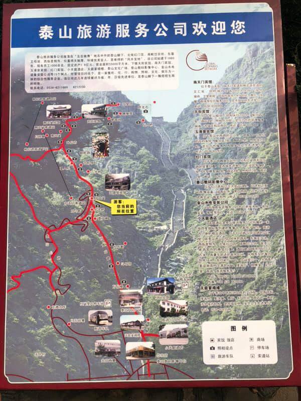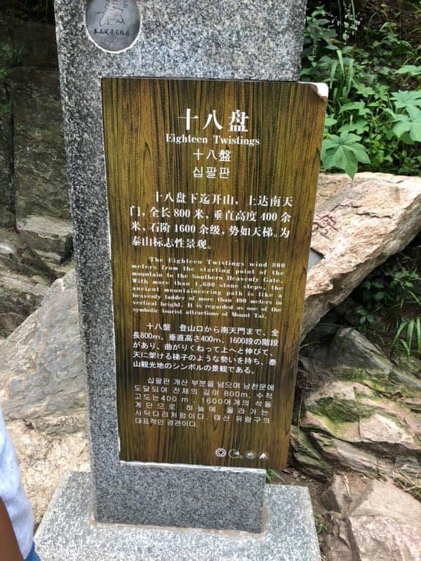 (泰山の紹介。山頂まで約9キロの道のりであり、この間ずっと石の階段7000段が途切れも無く続いている。)