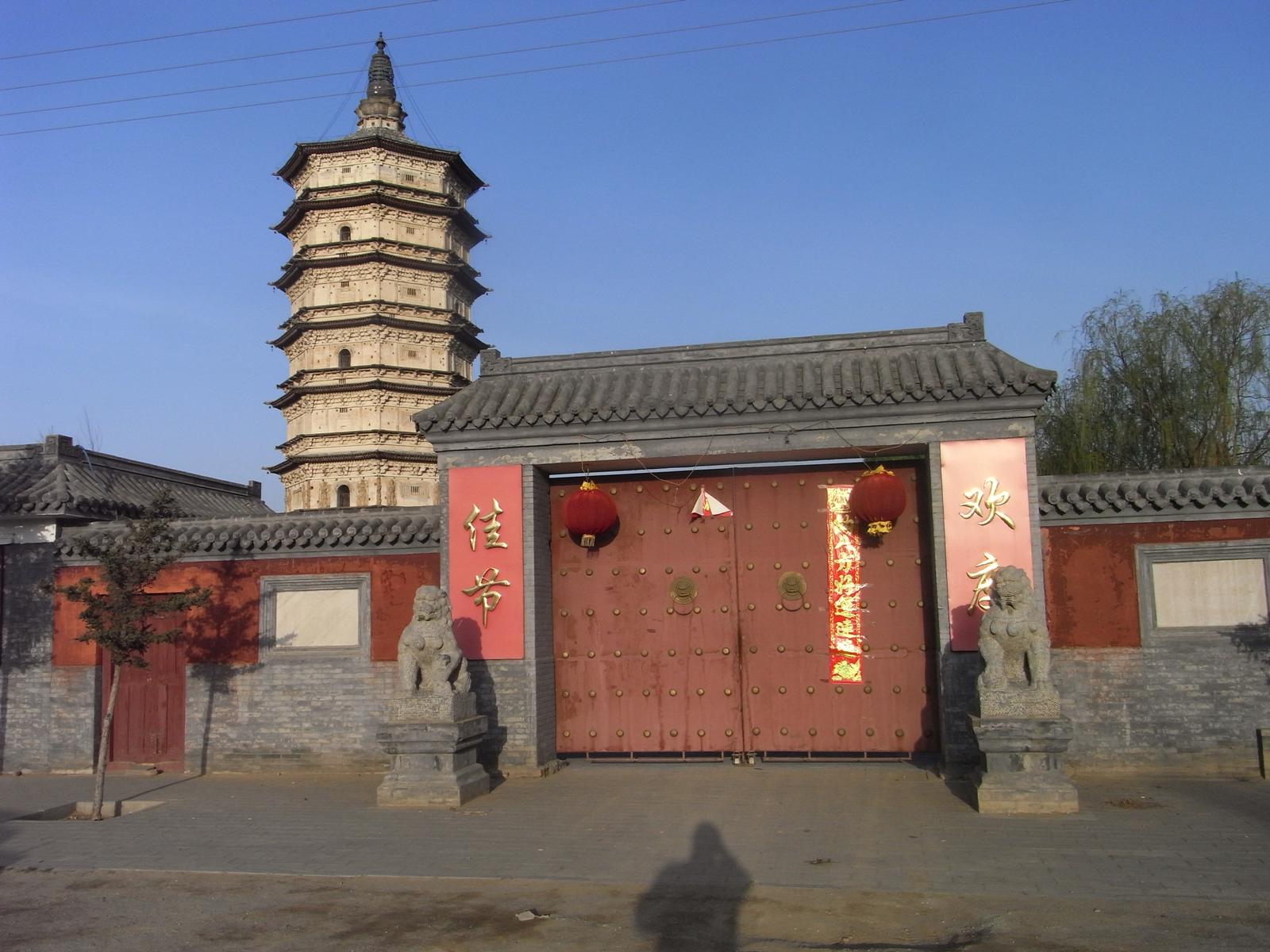 (遼の聖宗の時代(971〜1031年)の創建で、代々改修を行う。八角七層・楼閣式のレンガと木材でできた塔で、高さ43m。基壇の上部は仰蓮弁に積み上げ、第一・二層の外壁に釈迦・菩薩・四天王・力士の像をはめこむ。いずれも造形が優美で精彩に富み、線の流れがきわめて流暢で、芸術性が極めて高い。)