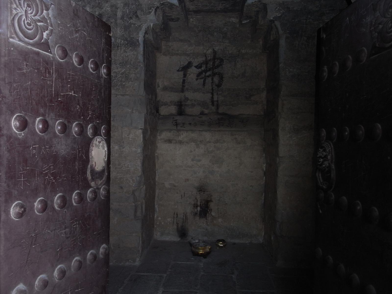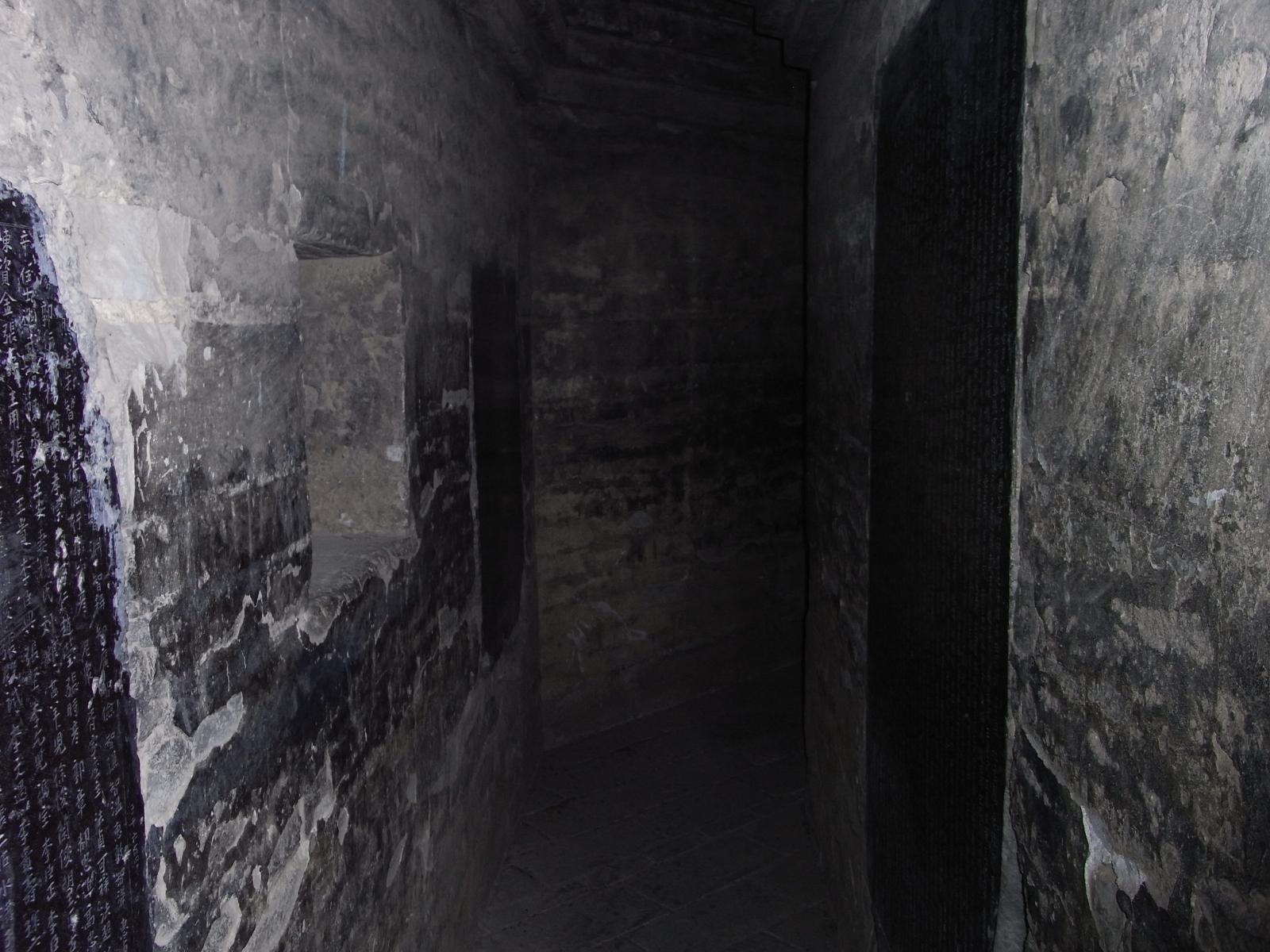 (万部華厳経塔の中を行きます。第一層の内壁には金代の石碑を6枚はめこみ、各層に代々訪れた人々の題記を漢語を中心に契丹小字、女真字、ウイグル体モンゴル字、パスパ文字、古シリア字、古ペルシア字などで記されています。そのうち、1162年の漢語の題記がもっとも古いです。)