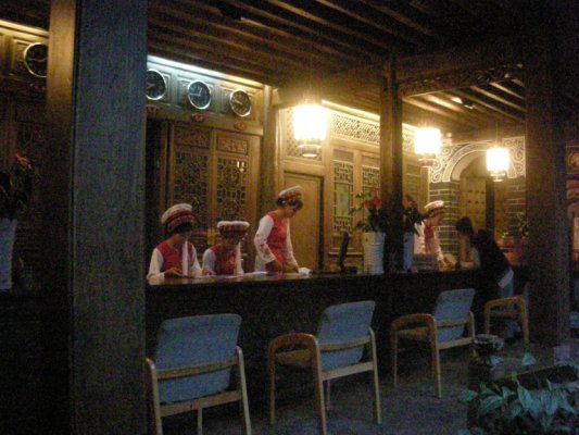 今回泊まったのは大理古城の民家を使ったホテルの大理松梅源酒店でした。受付の女性を含め、女性職員がすべて白族の衣装を着ている他、細かな木彫りの壁に囲まれた大理地方の独特の建物から観光客に大理の昔の暮らしを感じることができ、楽しませてくれました。