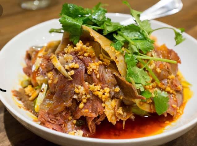 (成都の有名なシビレるような辛さの美味しい料理「夫妻肺片」です。牛の頭の皮、心臓、舌、レバー、そして胃袋などを使います。)
