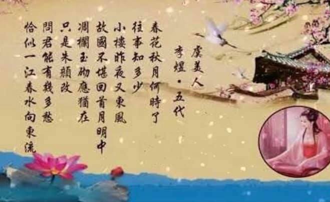 この漢詩の作者、李Uは五代十国時代、今の江蘇省、 江西省、福建省を中心に、三代にわたって栄えた南唐最後の国主でした。李U は文学的・芸術的な才能に優れた人でしたが、君主としての政治的能力はほとんどなく、この当時北西方の強国「宋」の圧力に屈して、自身の江南国の都の金陵(南京)から、北西にある宋国の都の開封に連行されて軟禁生活を送っていました。