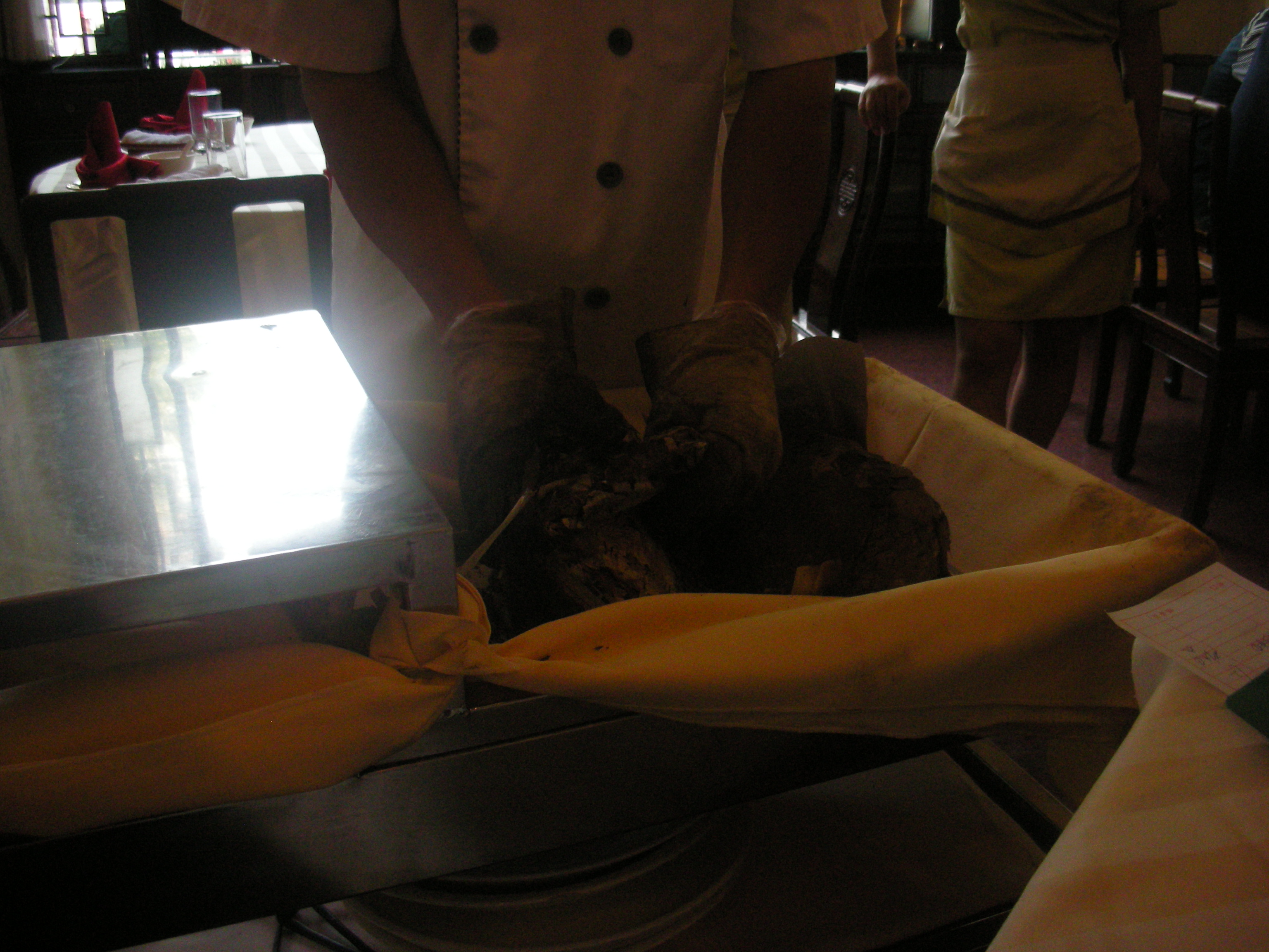 鶏肉を丸ごと蓮の葉に包み、粘土で固めて蒸し焼きにしたものです。料理人が運んできて目の前で取り除いていってくれます。鶏一羽が原型をとどめたまま出てきますが、蓮の香りがしており、肉の油分が抜け、醤油ベースのスープでさっぱりとした味付けになっています。さっぱりした味付けが多い杭州料理を代表する料理ですね。