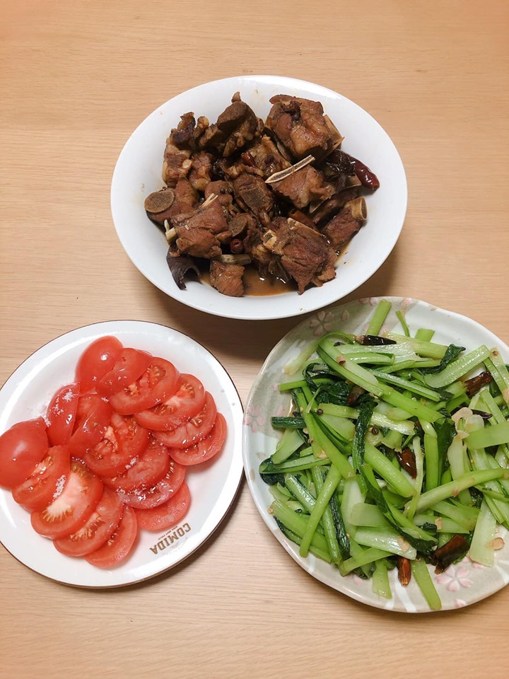スペアリブを煮込んでいる時に野菜を準備しておき、肉が出来上がったら盛り付けして出来上がりです。紅焼排骨を作っていると外までたまらないにおいがしてきてお腹がすいてきます。ご興味のある方は是非試してみてください。
