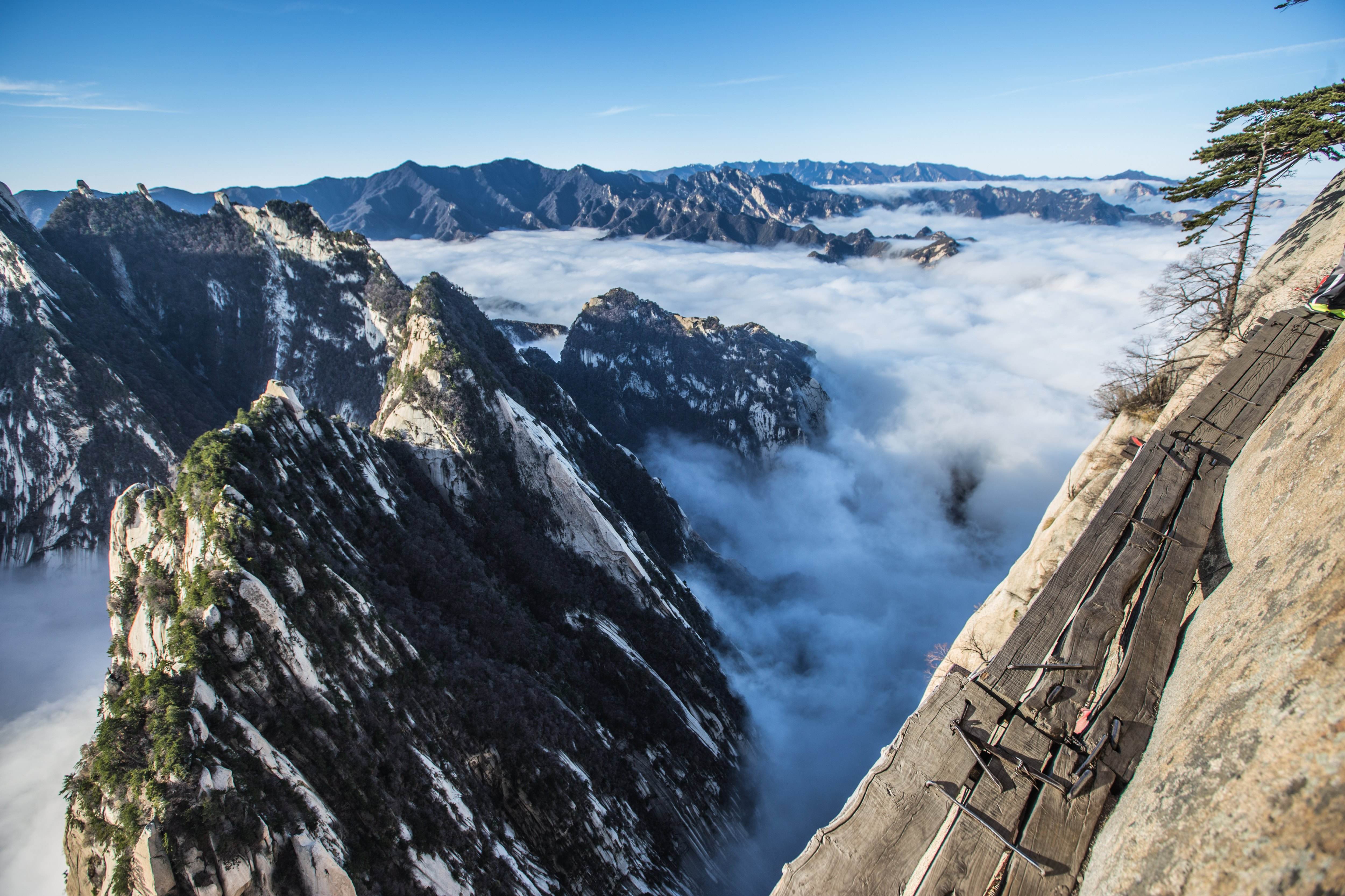 東峰から南峰へ向かって進むと、絶壁に設けられた幅数十cmの足場しかない長空桟道があります。ここは希望者だけが足を踏み入れる、いわば肝試しのポイントです。ご興味があれば税火歩いてみてください。