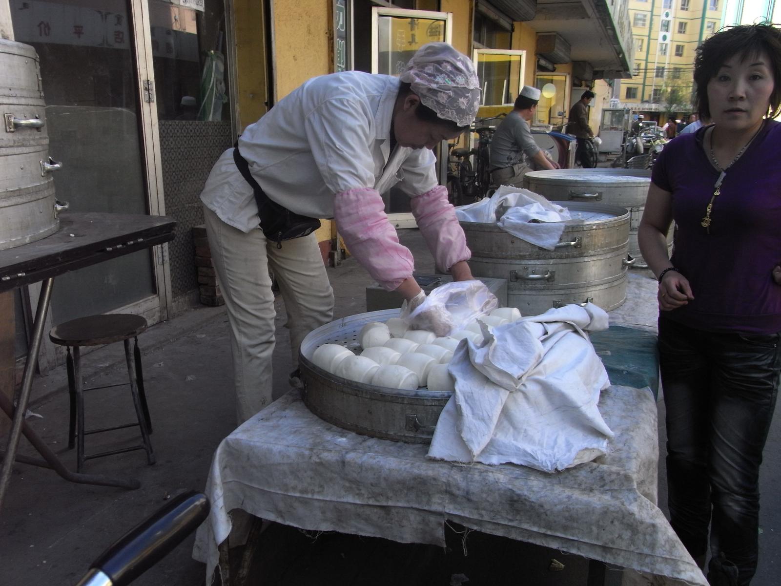 (饅頭を売っています。肉の入っていない肉まんのような感じです。)