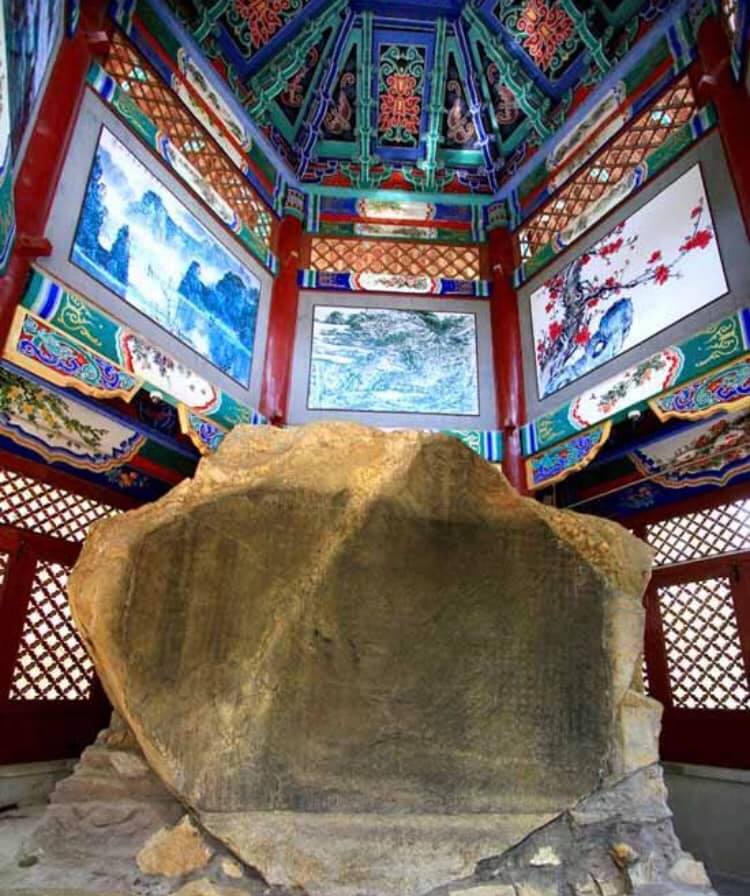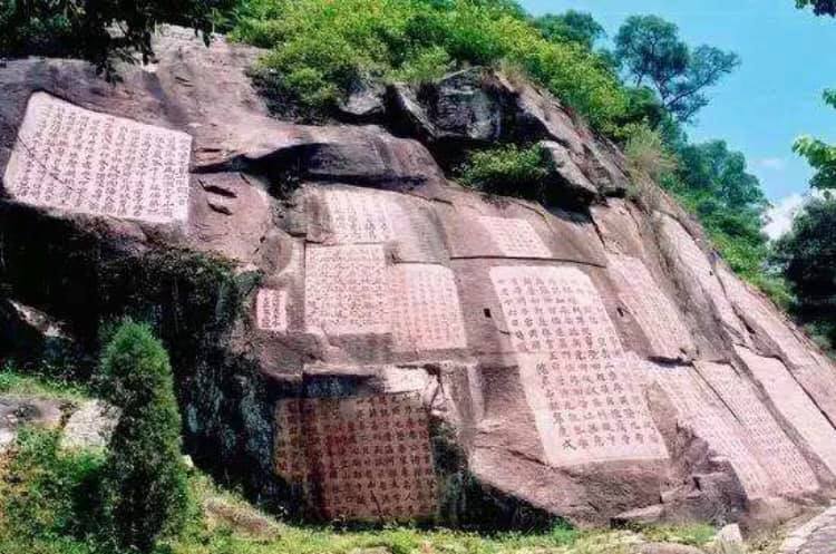 磨崖碑とは、磨かれた石にではなく、自然の岩に文字を彫ったものです。「石碑」と異なり、小さな文章を刻んだ岩のことです。紙が発明される前は「書丹」といわれる、石面に直接文字を書いてから彫っていました。青空のもと、自然の岩石相手に筆をふるうのは、さぞ気持ちがよかったことでしょうね。