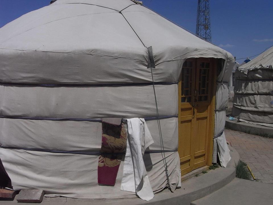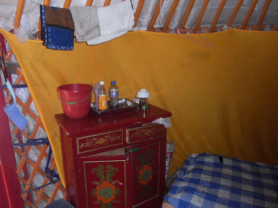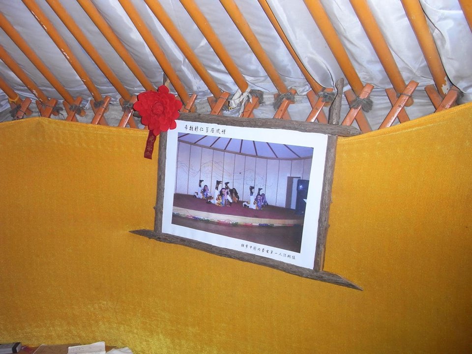 遊牧生活を営なむモンゴル民族が住むのはゲルと呼ばれる外側がほぼ白一色との素朴な移動式組立住居。しかし内部はそんな外見からはちょっとと想像もつかないくらいのカラフルさ。ゲルの側面には窓がなく、天窓からの採光のみ。換気や明るくしたいときには扉をあけて外光を入れます。