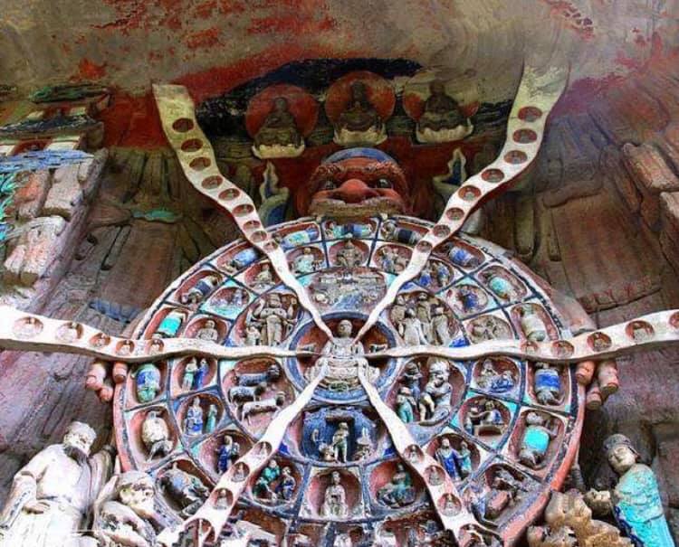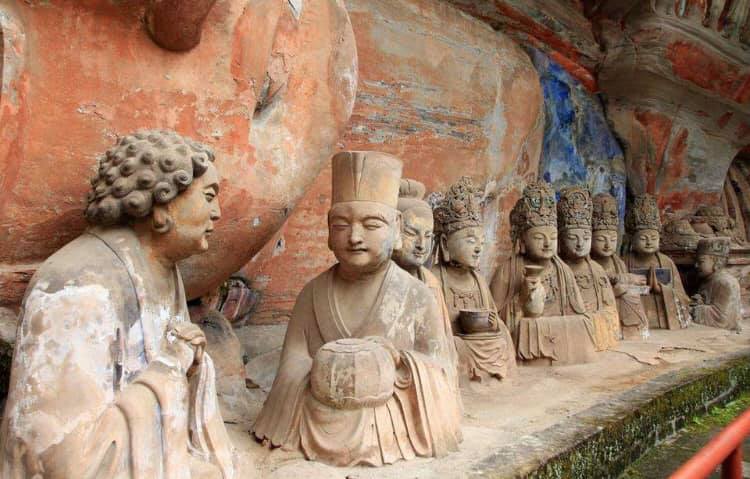 石窟は、インドからシルクロードを経て中国に伝わりました。中国の石刻群はインドの仏教の影響を受けたものが多いのですが、この大足石刻は仏教、儒教、道教を取り入れた中国独自の文化が見えるものとなっています。649年に大足石刻が切り開かれ、現在は5万体もの石刻を見ることができます。