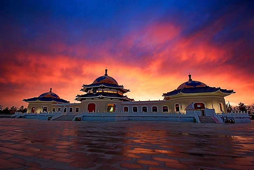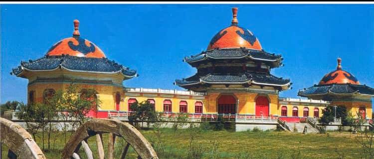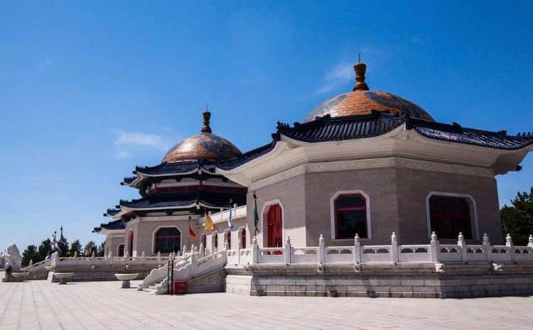 12世紀頃のモンゴル族首領チンギスハンの陵墓はモンゴル族の住居パオの形をした3つの大殿からなります。その中央が記念堂で後方にはチンギスハン夫妻の柩が安置されています。