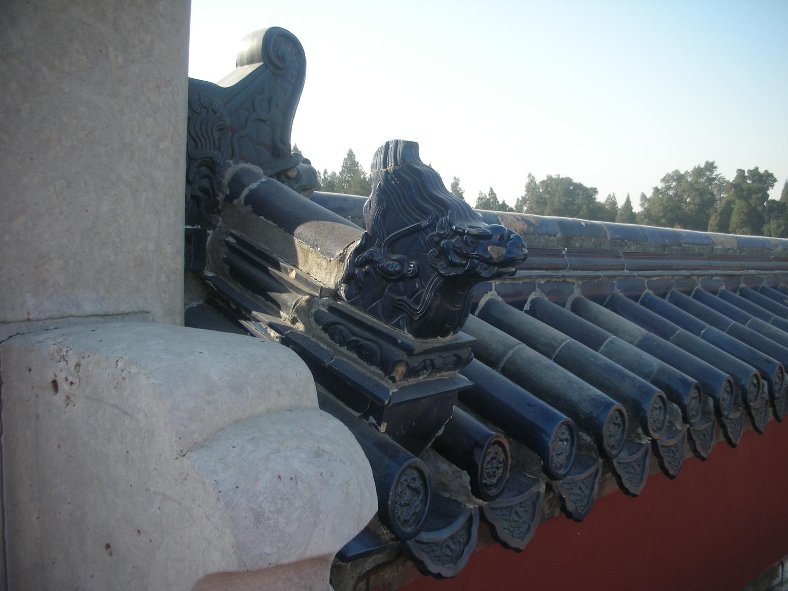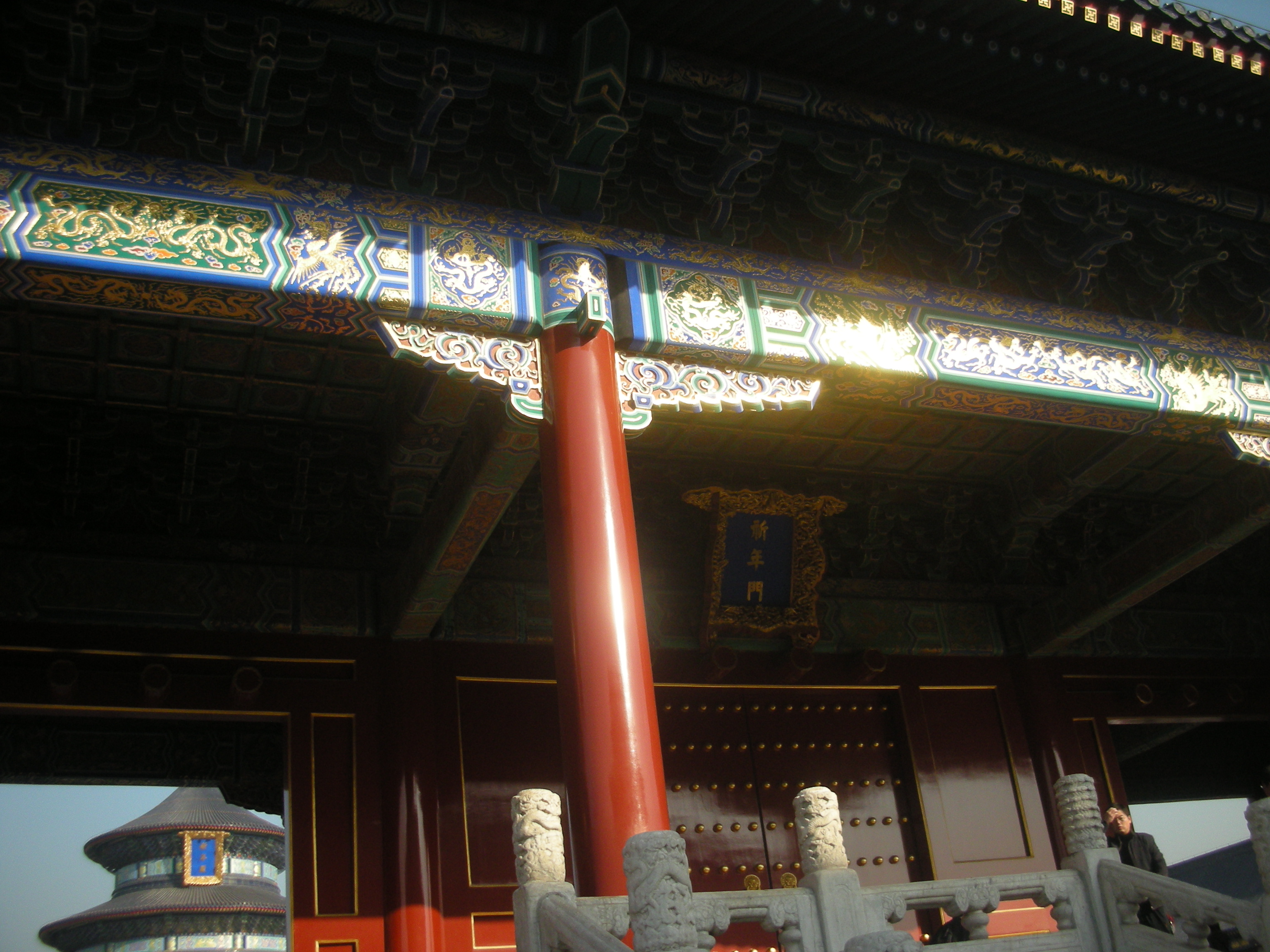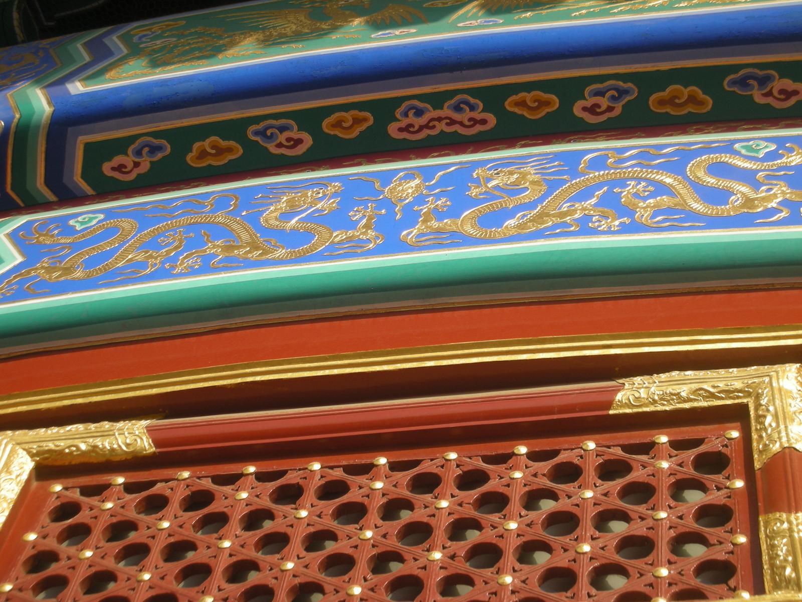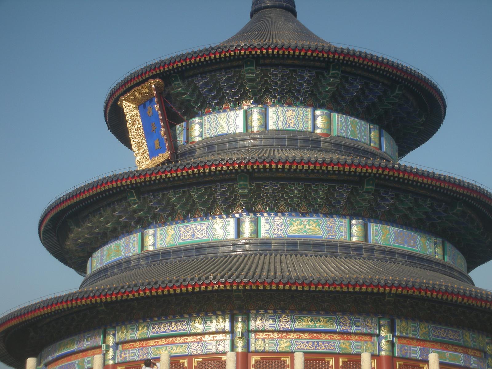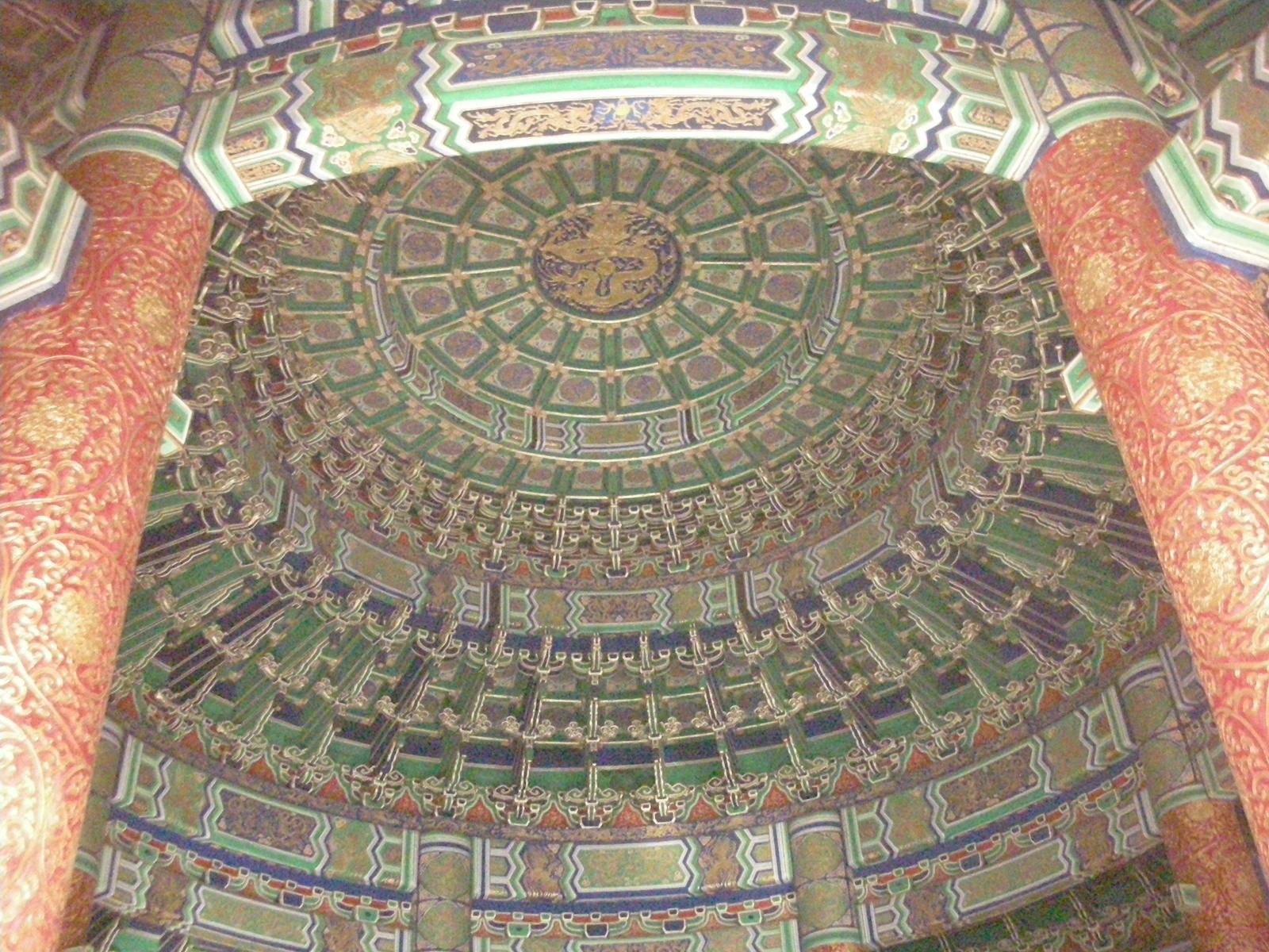 また天壇公園の中には皇帝が月の上辛(最初の辛の日)に五穀豊穣を祈った祈谷壇もあります。金色をふんだに使った内観には四季を表す絵柄の描かれた4本の柱が中央に、12ヶ月を表す12本の柱が外側にそびえ、それぞれの柱には皇帝の力を示す鳳凰や龍が彫刻されています。基壇は3層で構成されていて、それぞれ地上、雲上、天上を表しています。