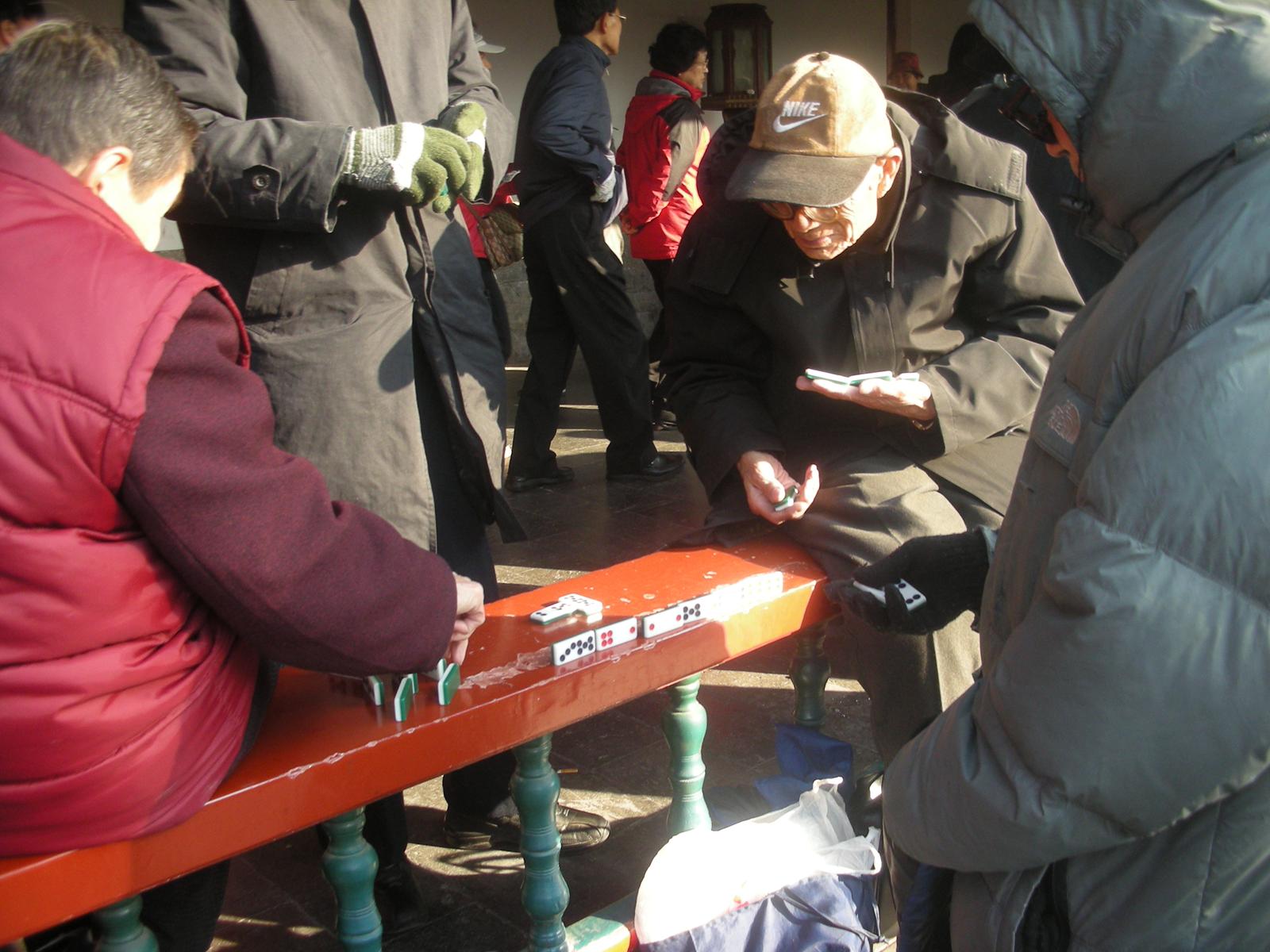 (長廊で遊ぶ人々。老人が多い。)