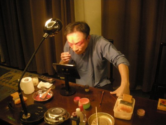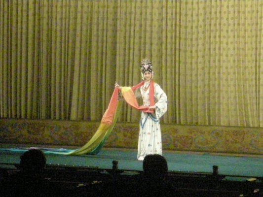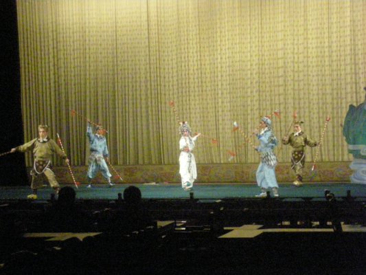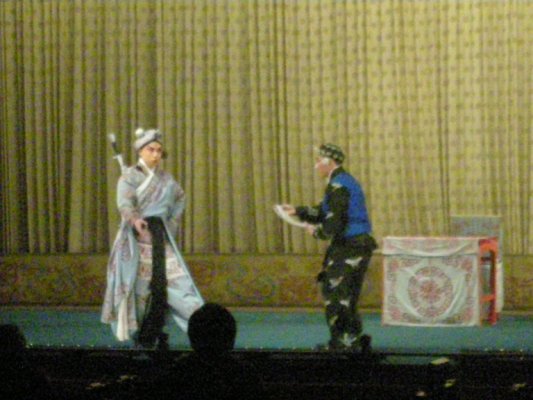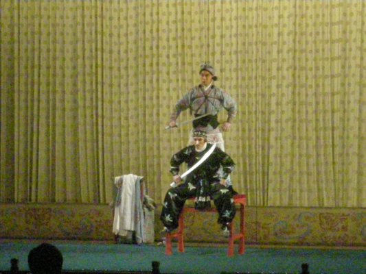 甲高い声と独特の??という独特の顔全体を塗り潰した化粧法が特徴的です。??の色によって役柄が決まっており、「赤」は必ず関羽です。また、一人だけおとぼけ役がいて、面白いメイクをしているので、すぐに分かります。