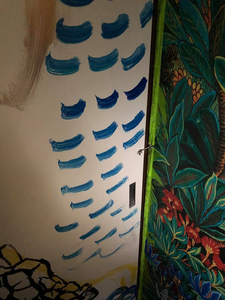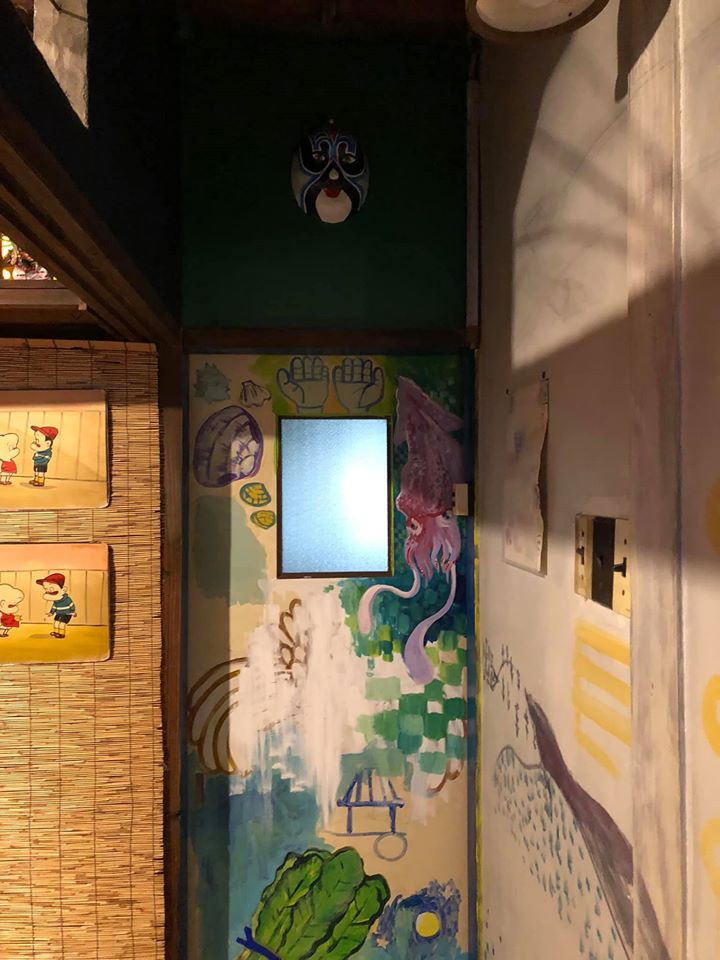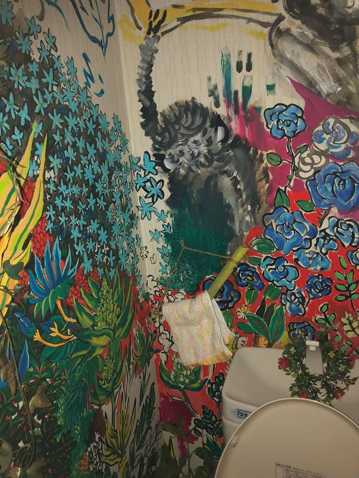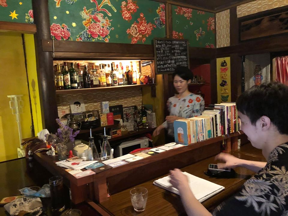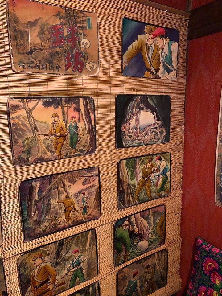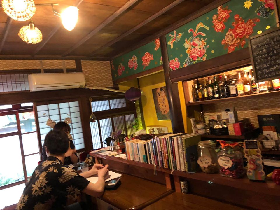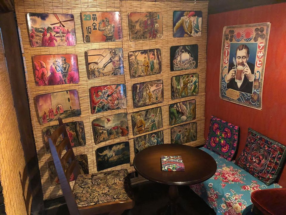店の中にはバーカウンターがあり、昔ながらの昭和の漫画が壁に飾られていました。トイレまで自然色に装飾されビックリしました。