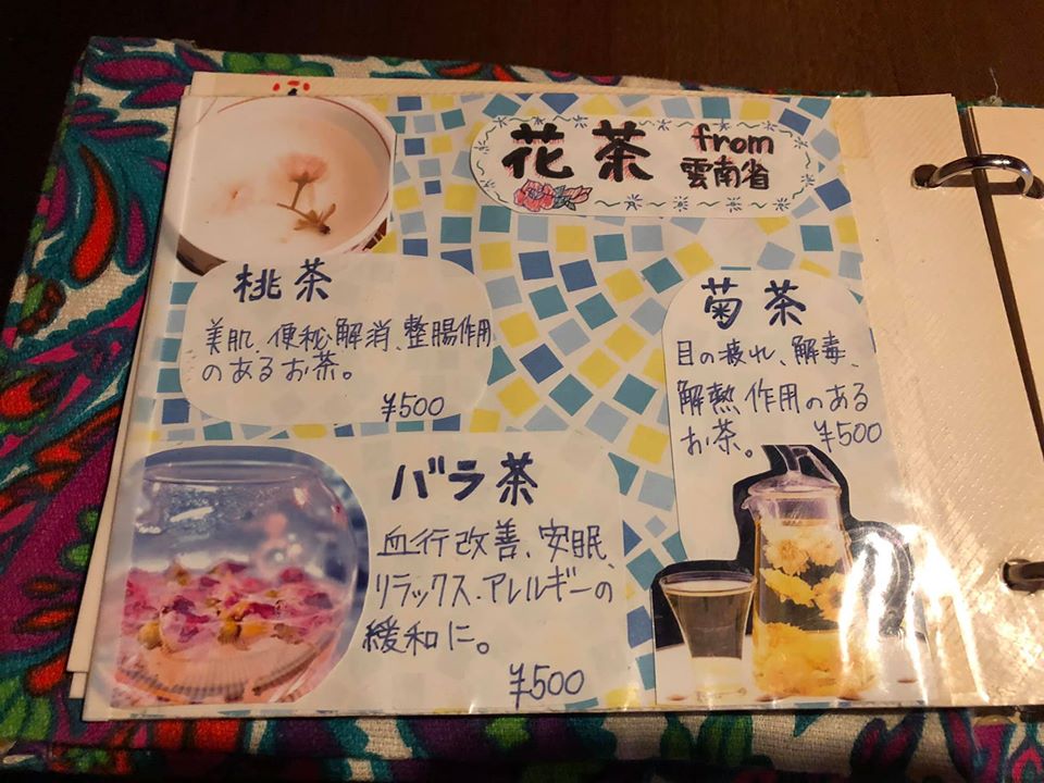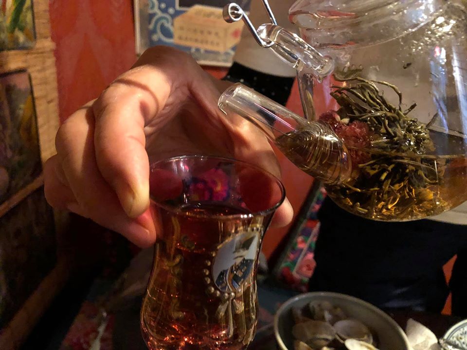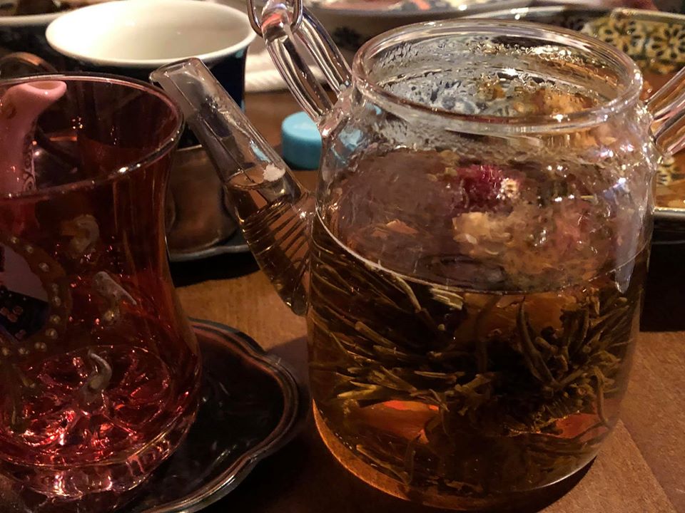 今日いただいたのは皮蛋豆腐、オリジナルカレー、昔ながらの明太子スパゲティ、あさりスパゲティでした。どれもあつあつ ふうふうの懐かしい味でした。食後にはきれいなお花が入った台湾工芸茶である喜恋花で寛ぎながら口直しできました。