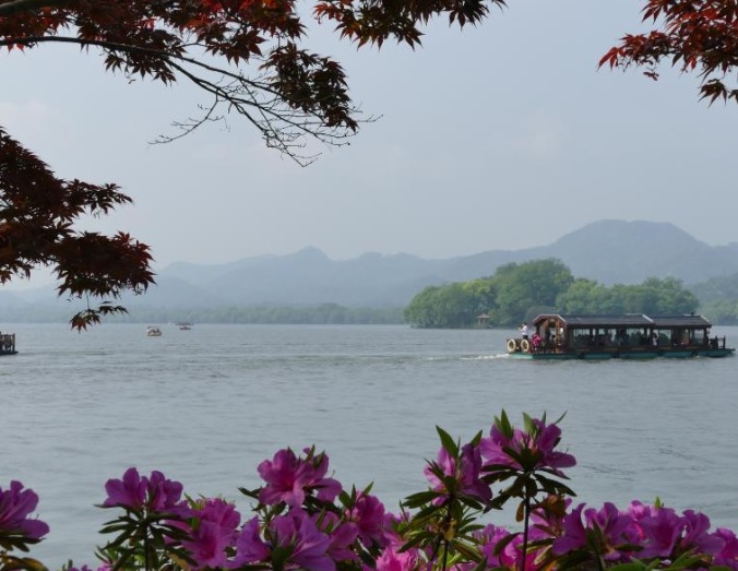 今日は西湖の旅行記の最後を締めくくるべく、春の桃の花の薄紅色と柳の新緑とのコントラストが美しい白堤の景観を詠んだ白居易の「春題湖上」を中国語で味わってみたいと思います。