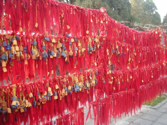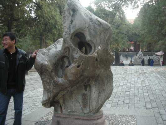 (天キョウ殿前の木。さっきの太湖石より回転して真直ぐ木の穴にいけたら運が良いとされる。)
