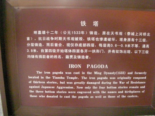 (かつては泰山頂上にあった鉄塔説明文。日中戦争で日本軍が壊したために麓に下ろした。)