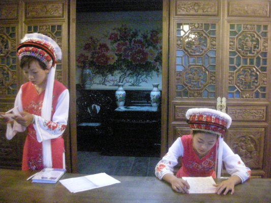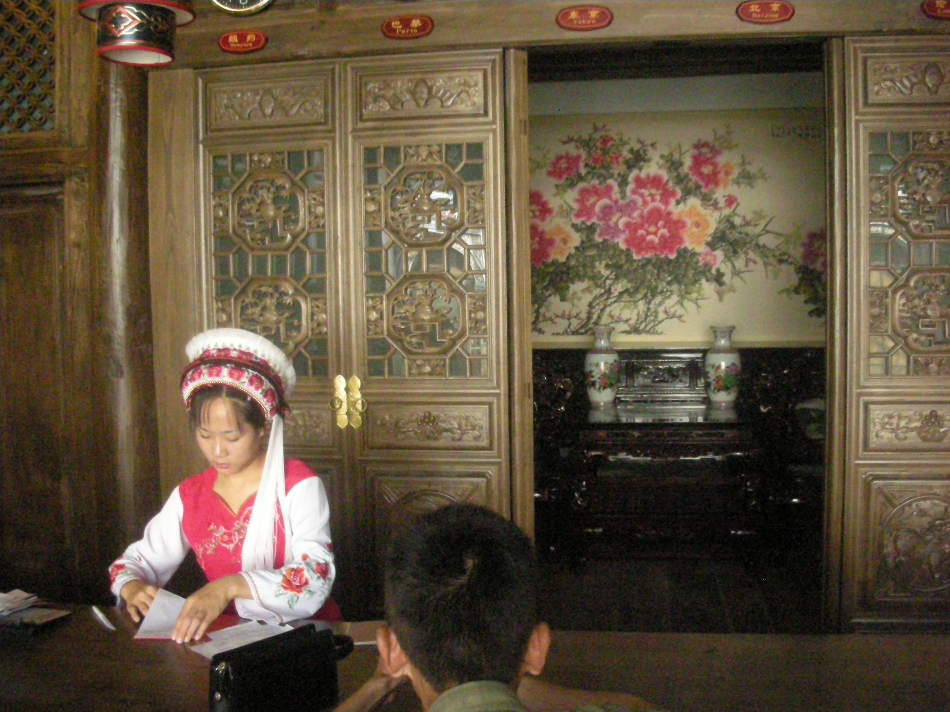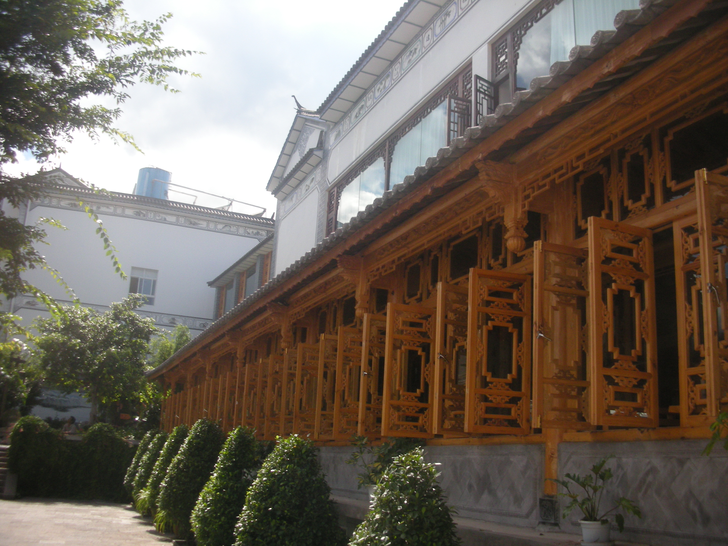 今回泊まったのは大理古城の民家を使ったホテルの大理松梅源酒店でした。受付の女性を含め、女性職員がすべて白族の衣装を着ている他、細かな木彫りの壁に囲まれた大理地方の独特の建物から観光客に大理の昔の暮らしを感じることができ、楽しませてくれました。