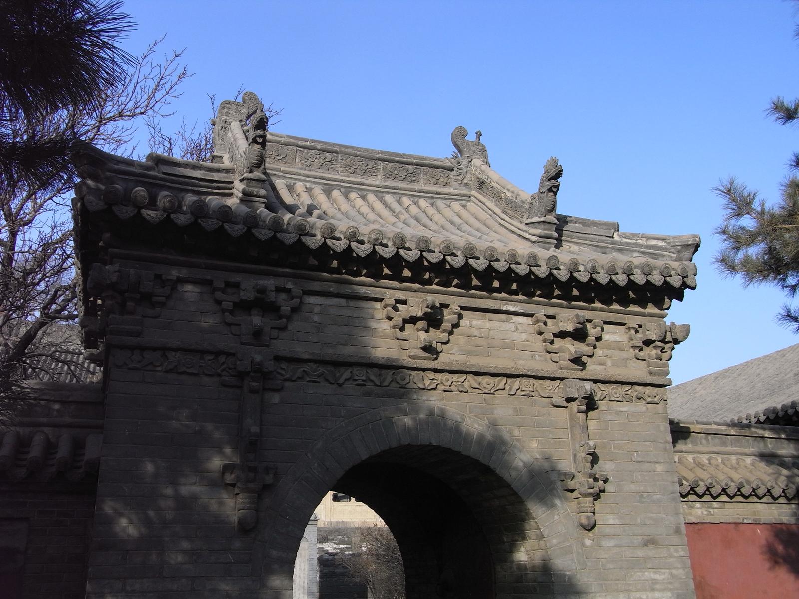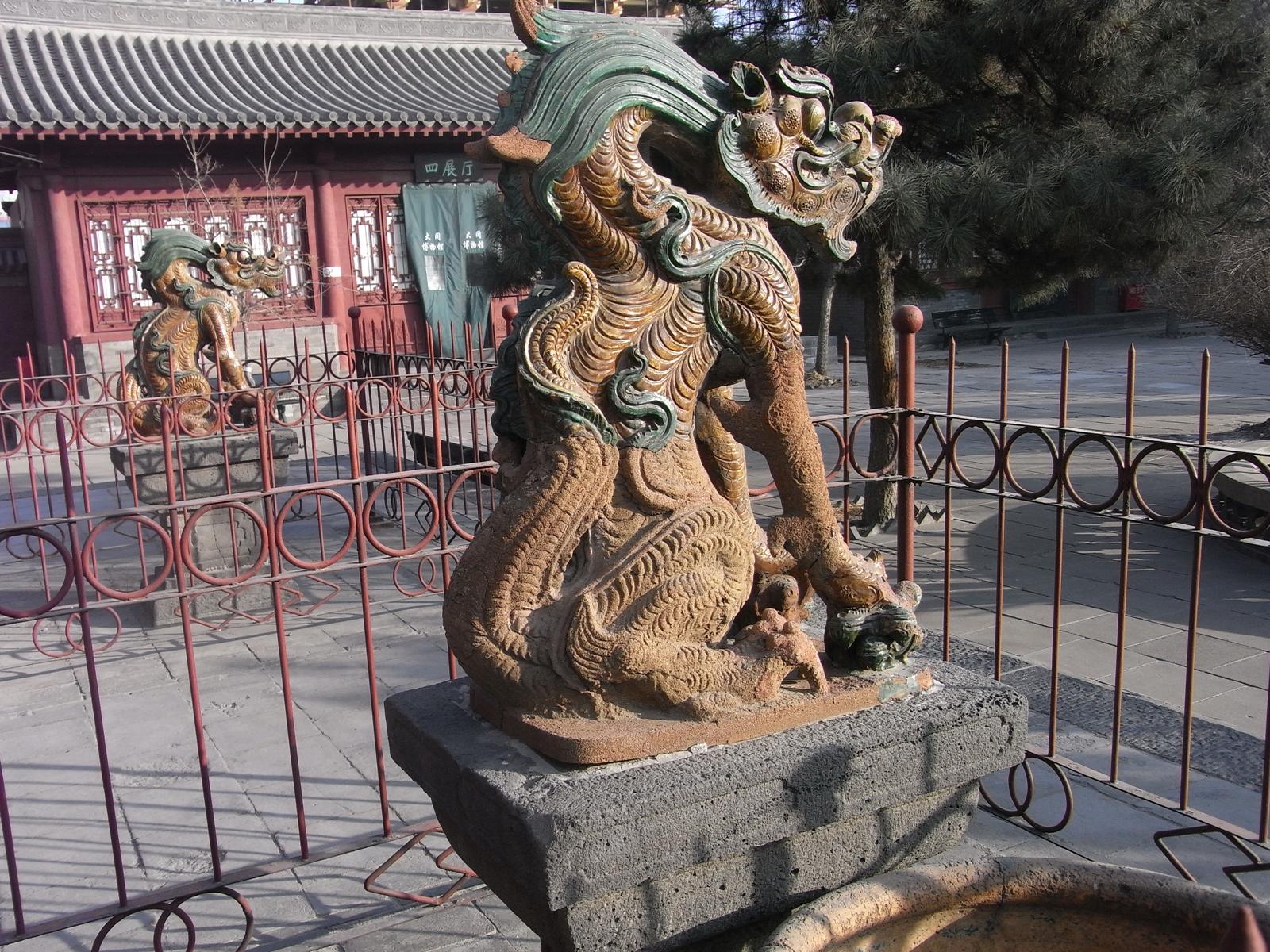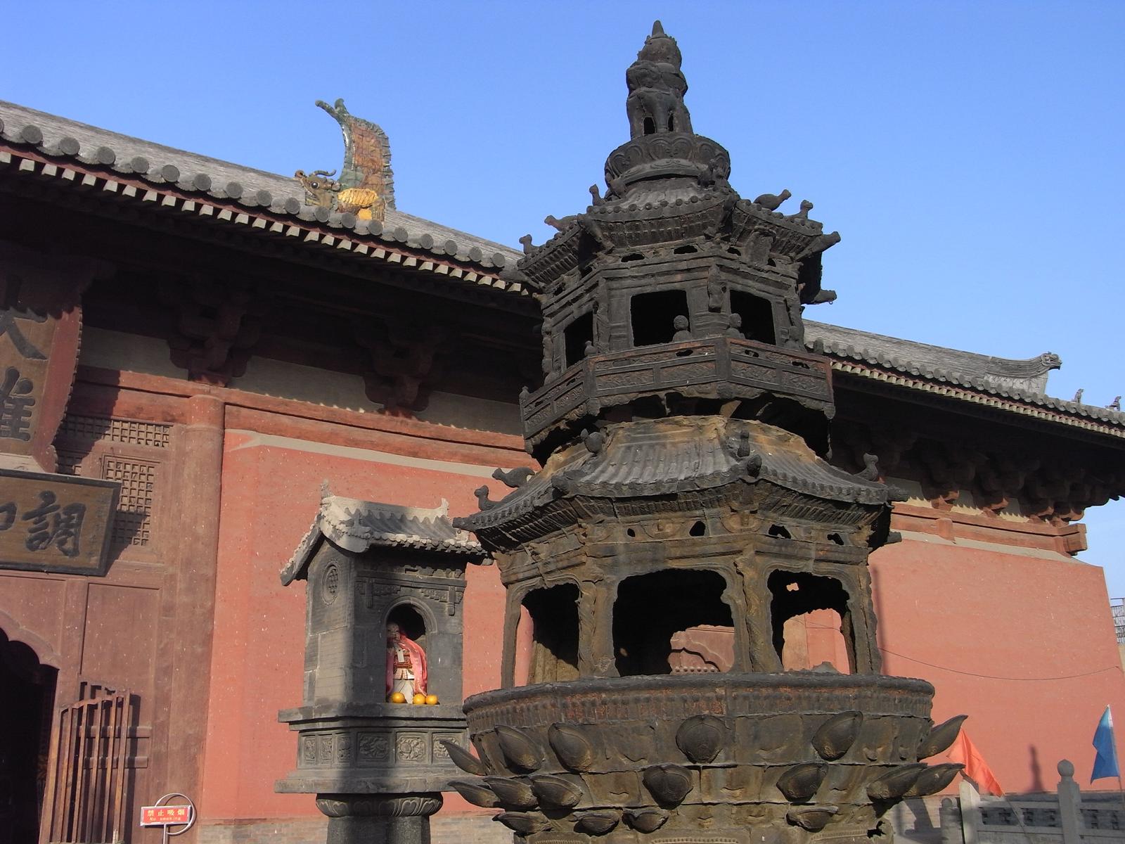 上華厳寺の大雄宝殿は中国でも有数の伽藍のひとつといわれ、遼、金代の建物としては現存する最大規模のものといわれています。また、軒高9.5メートルの寄棟造りの屋根におかれた琉璃製の瓦もすばらしいです。殿内には明代の5体の仏、20本の諸天の塑像があるほか、清代の壁画も保存されています。