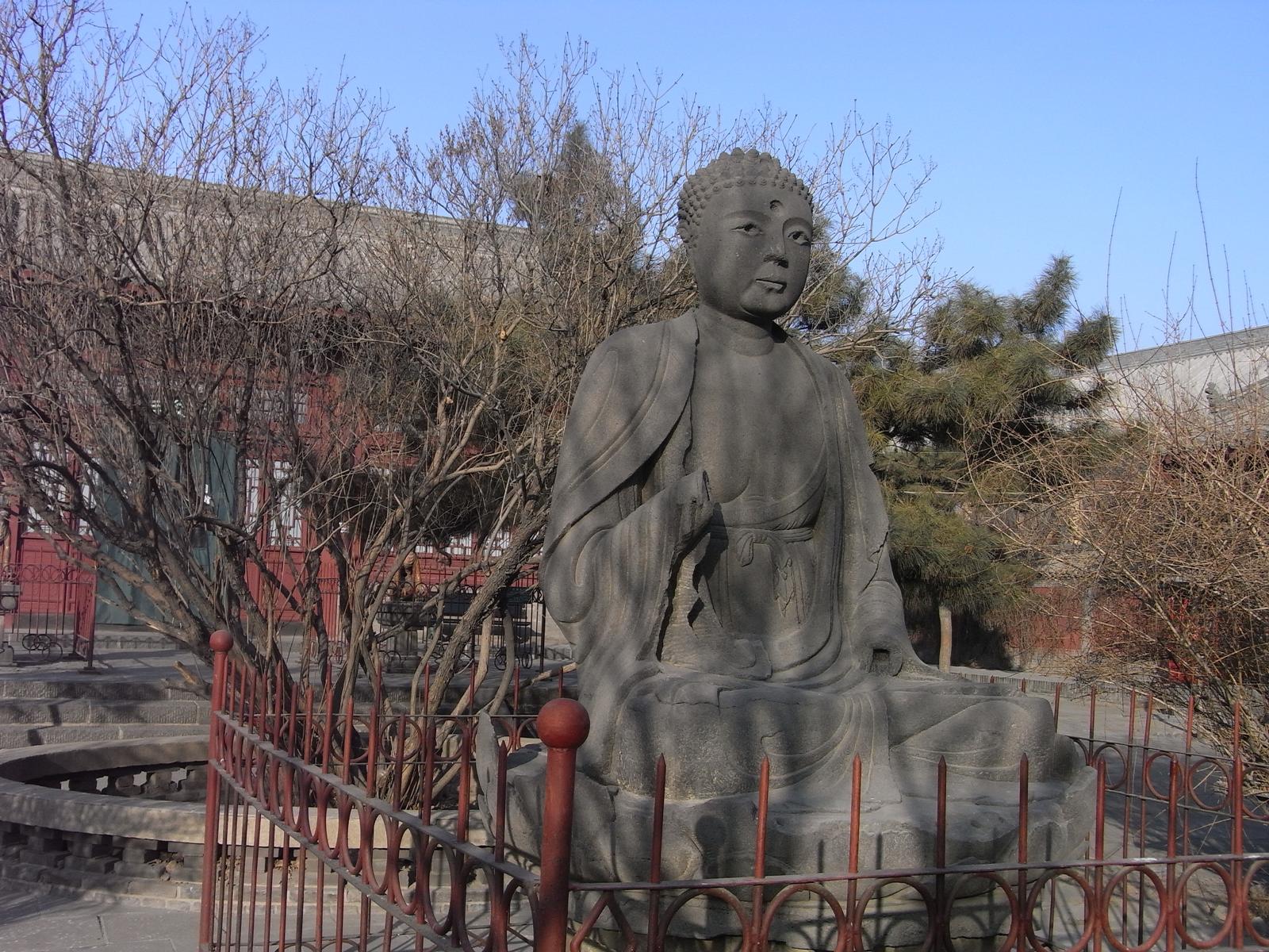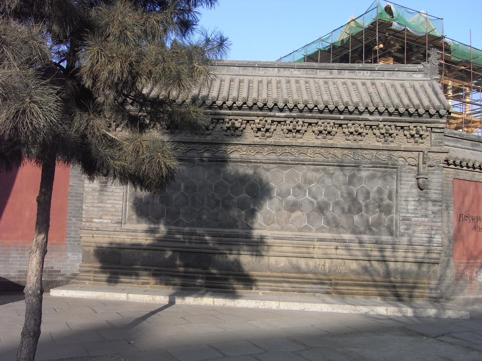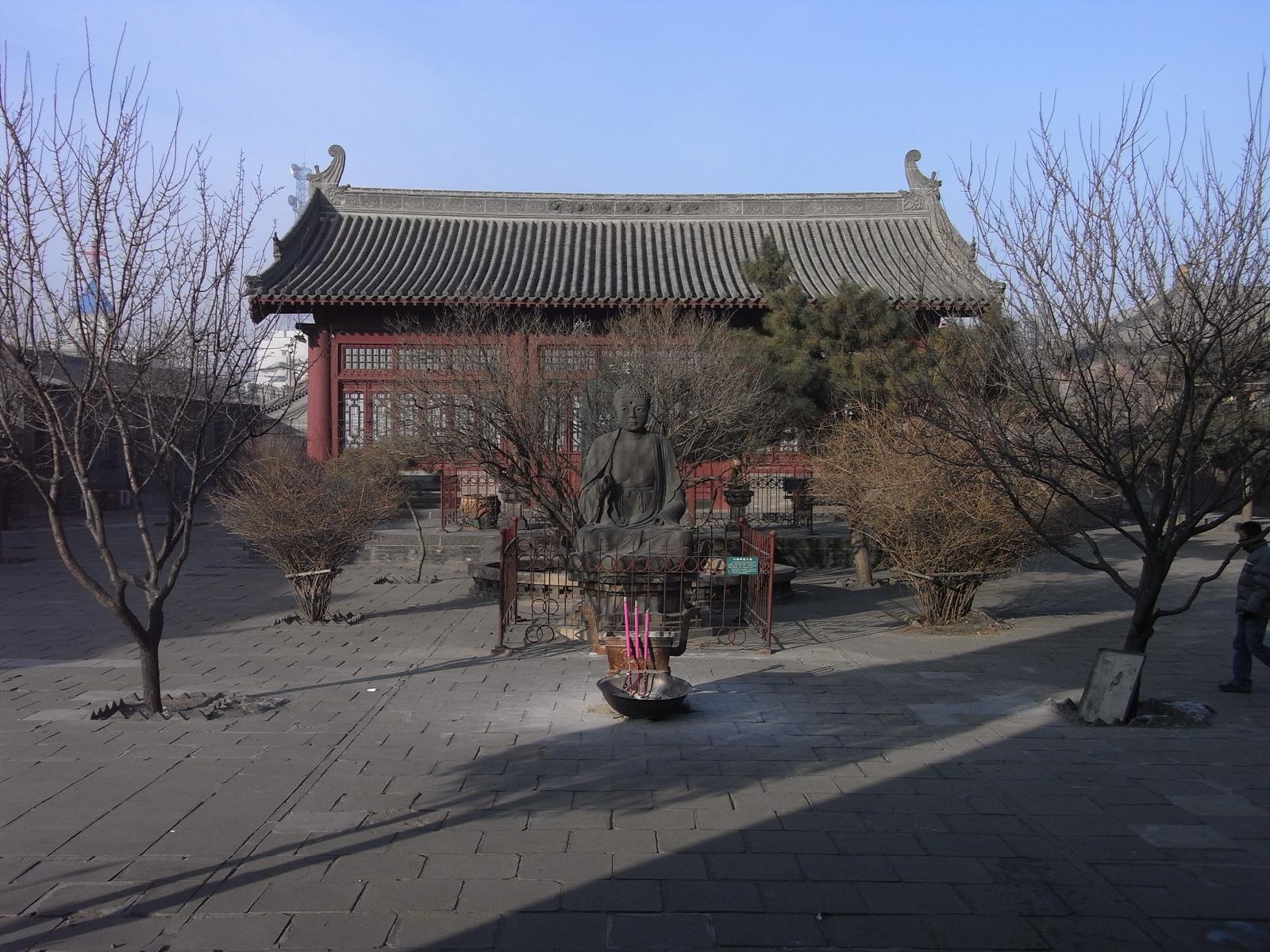 遼代1062年建立、金代1140年再建の大雄宝殿。斜斗拱に金代の特徴が出ている。いわゆる減柱法により前方空間を広く取っている。4.5mの鴟尾は金代のもの。月台は、高さ4m凸型形状で、遼金代の典型。仏像は明代のもの。木組は、材が太く豪快、壁面は清代の壁画で埋め尽くされている。