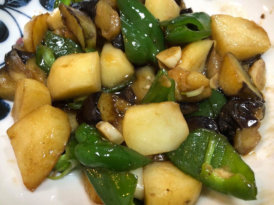 マーシーの美味しい3分中華料理クッキング!大地から授かった三つの宝、地三鮮(なすとピーマンとじゃがいもの素揚げの炒め物))