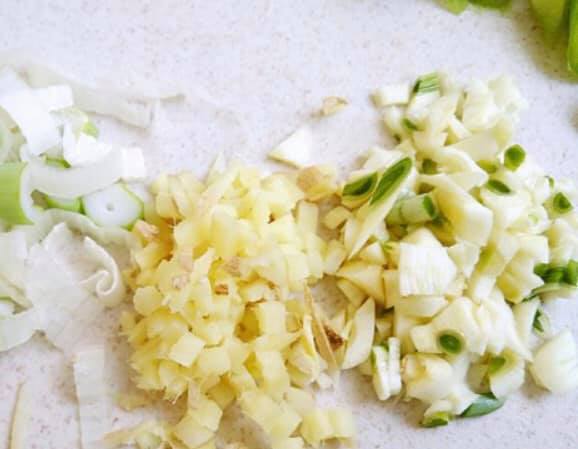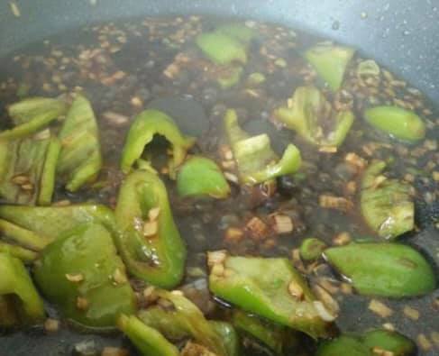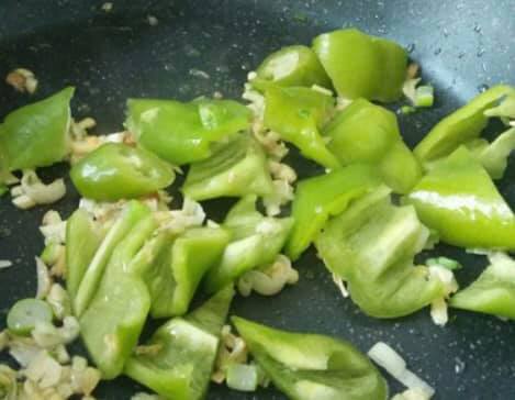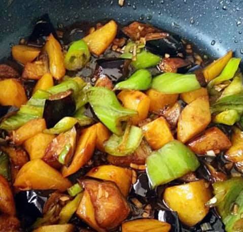5.別の鍋に少量の油を熱し、みじん切りにしたニンニク、ネギを炒めて香りを出す。続いて4のピーマンを炒めてから全ての調味料を加えて味を調える。、ナスとジャガイモを加えて炒める。
