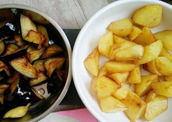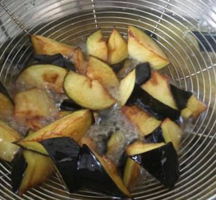3.ジャガイモに火が通ったら、取り出して油を切っておく。続いてそのままナスを加え、きつね色になるまで揚げる。