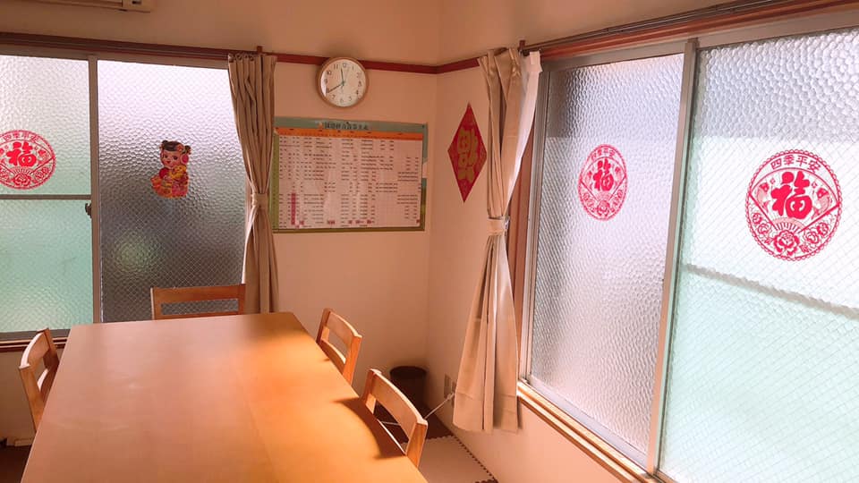 スマイル教室の窓には対聯以外に"福の字"を貼り付けました。中国には福の字”を逆さにして貼り付ける習慣がありますが、これは福が来るという意味です。なぜなら中国語の"福倒了"(発音:フー ダオラ。福を逆さにするという意味)"と"福到了"(発音:フー ダオラ。福が来るという意味)"の発音が同じだからです。