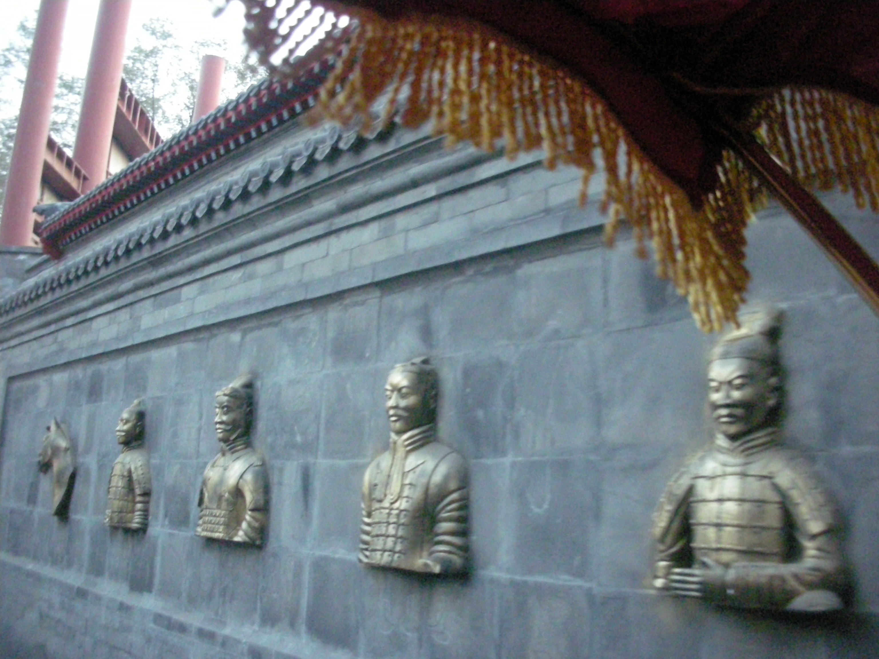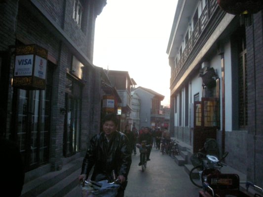 (胡同の路地。兵馬俑の兵士の彫刻がある。)
