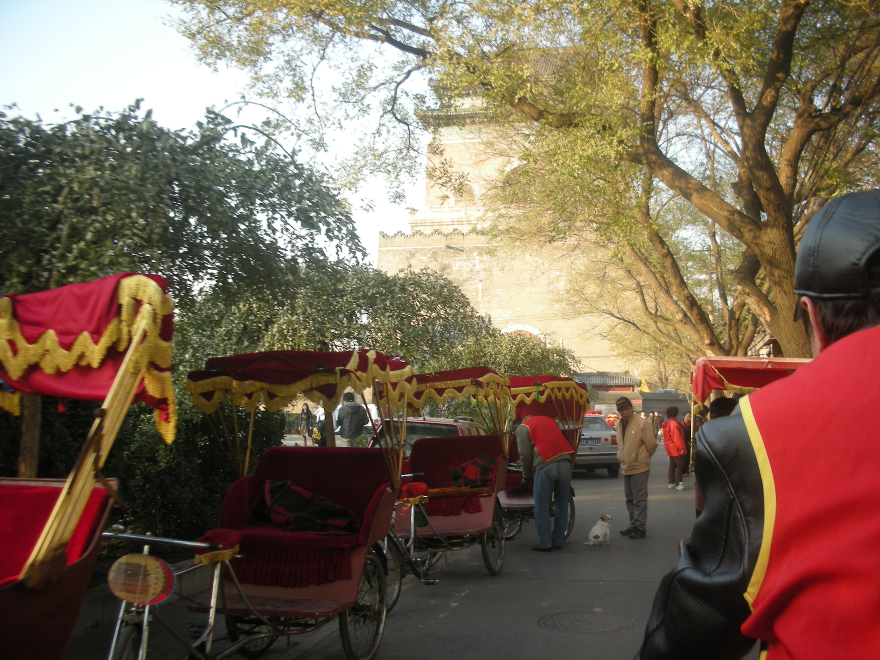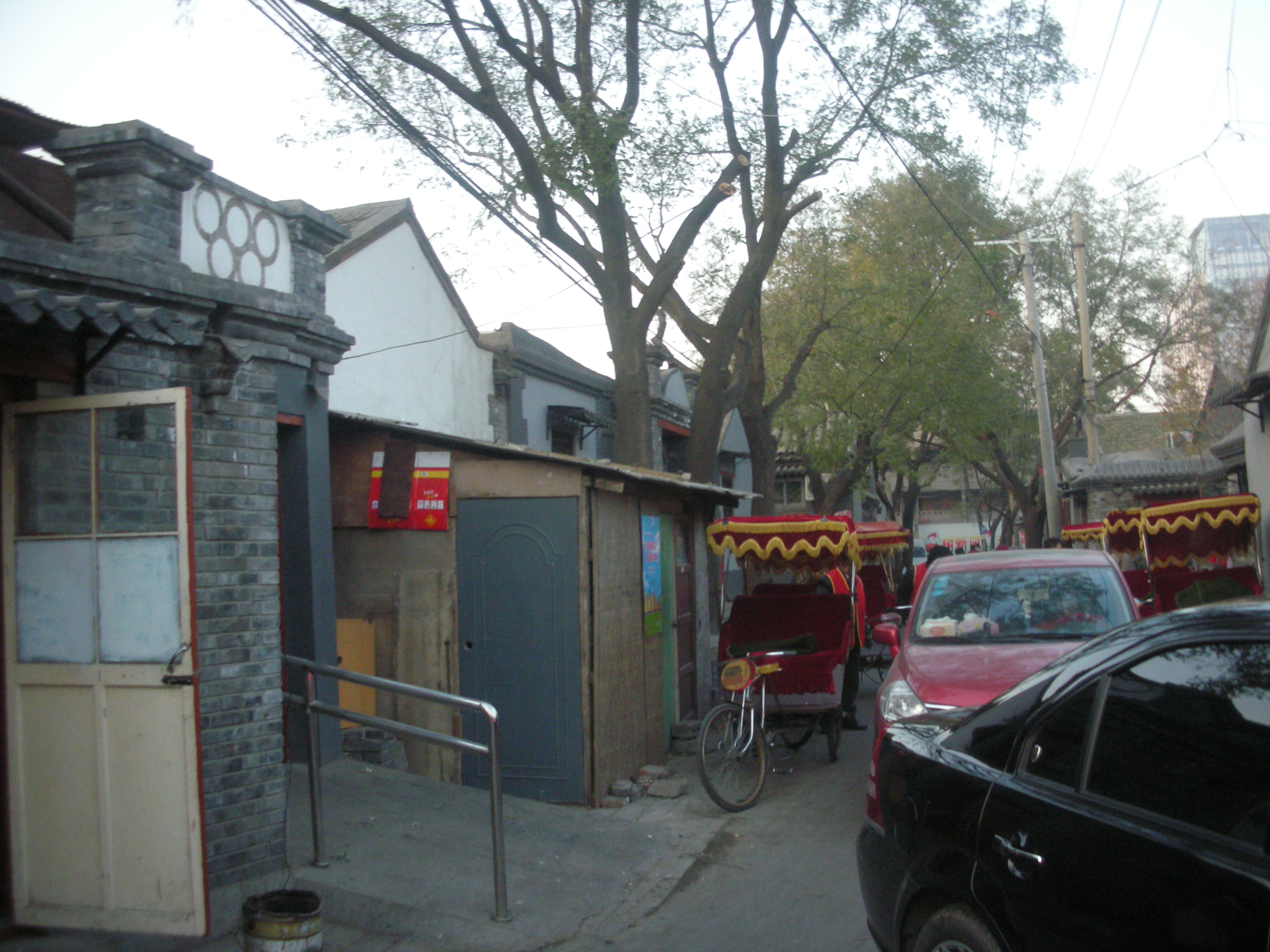 (胡同の路地に並ぶ人力車。)