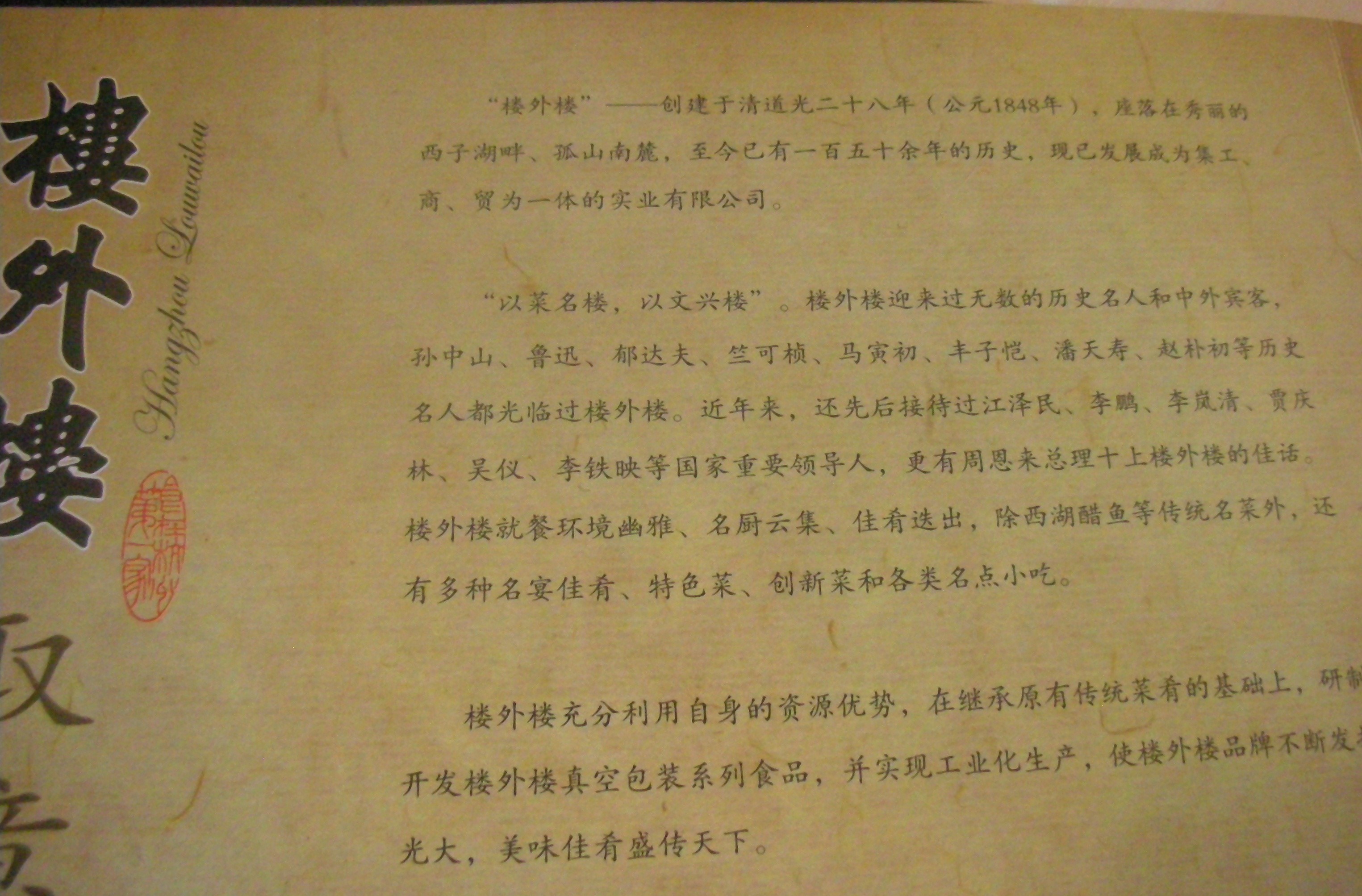 まず最初に楼外楼。創業1848年で西湖北側の 「孤山」 にあります。孫文や魯迅をはじめ、歴代の要人たちも訪れています。