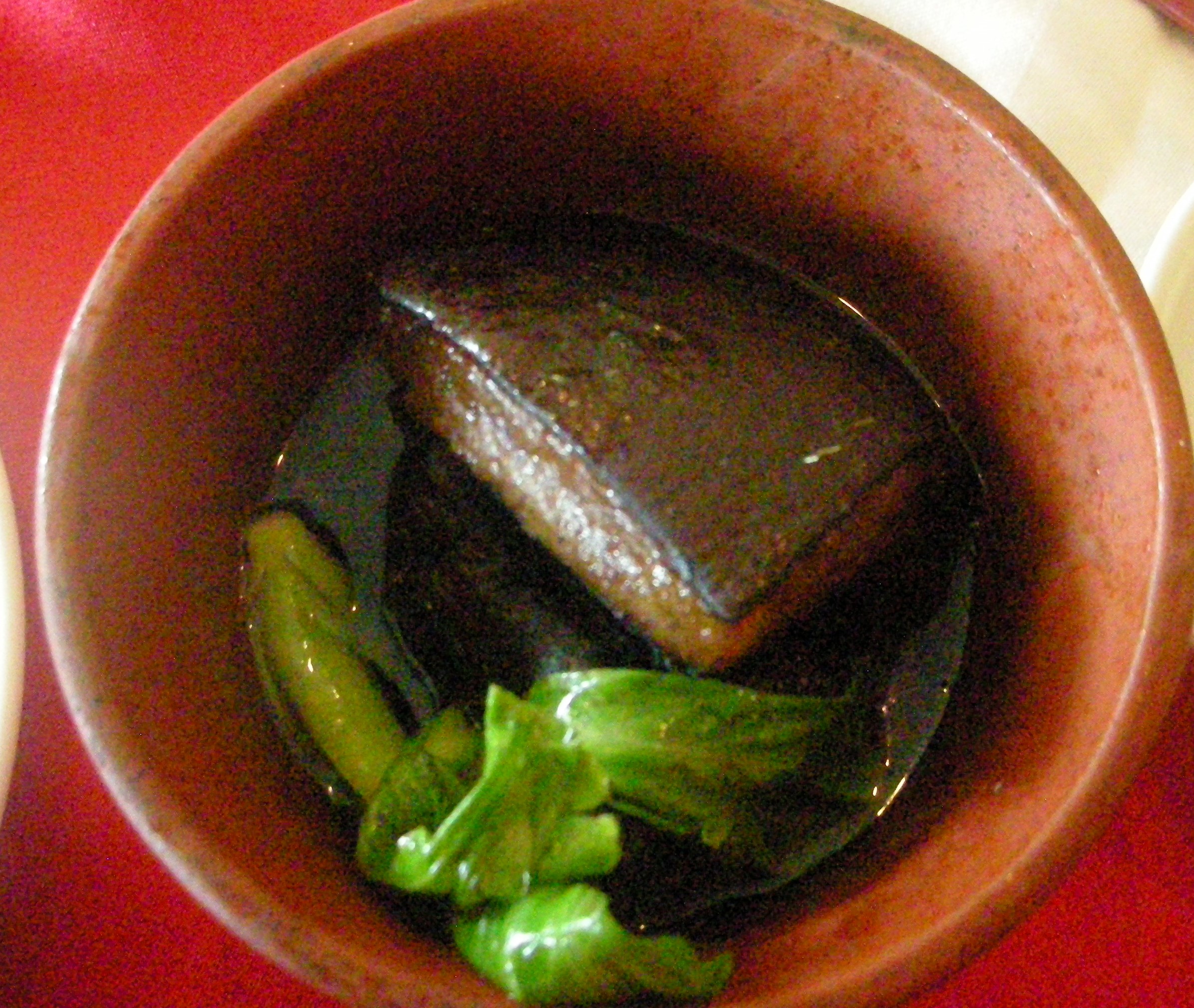 薄い皮つきの柔らかい角切りの豚バラ肉に生姜、ネギ、砂糖、紹興酒、および醤油などを加え土鍋で直時間トロトロになるまで煮込んだものです。北宋時代の杭州の知事であり、詩人としても有名な蘇東坡にちなんで名づけられた杭州料理の1つです。見た目ほどには脂っこくなく、甘辛で、あまりの美味しさにほっぺたが落ちそうになりました。添えつけの蒸しパンに包んでも一味違った味わいが楽しめます。