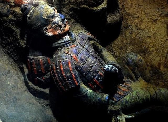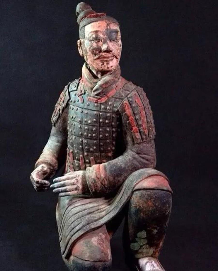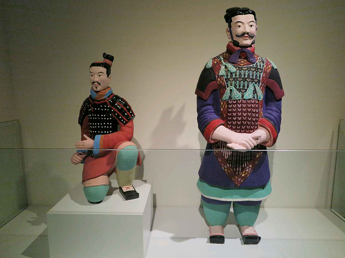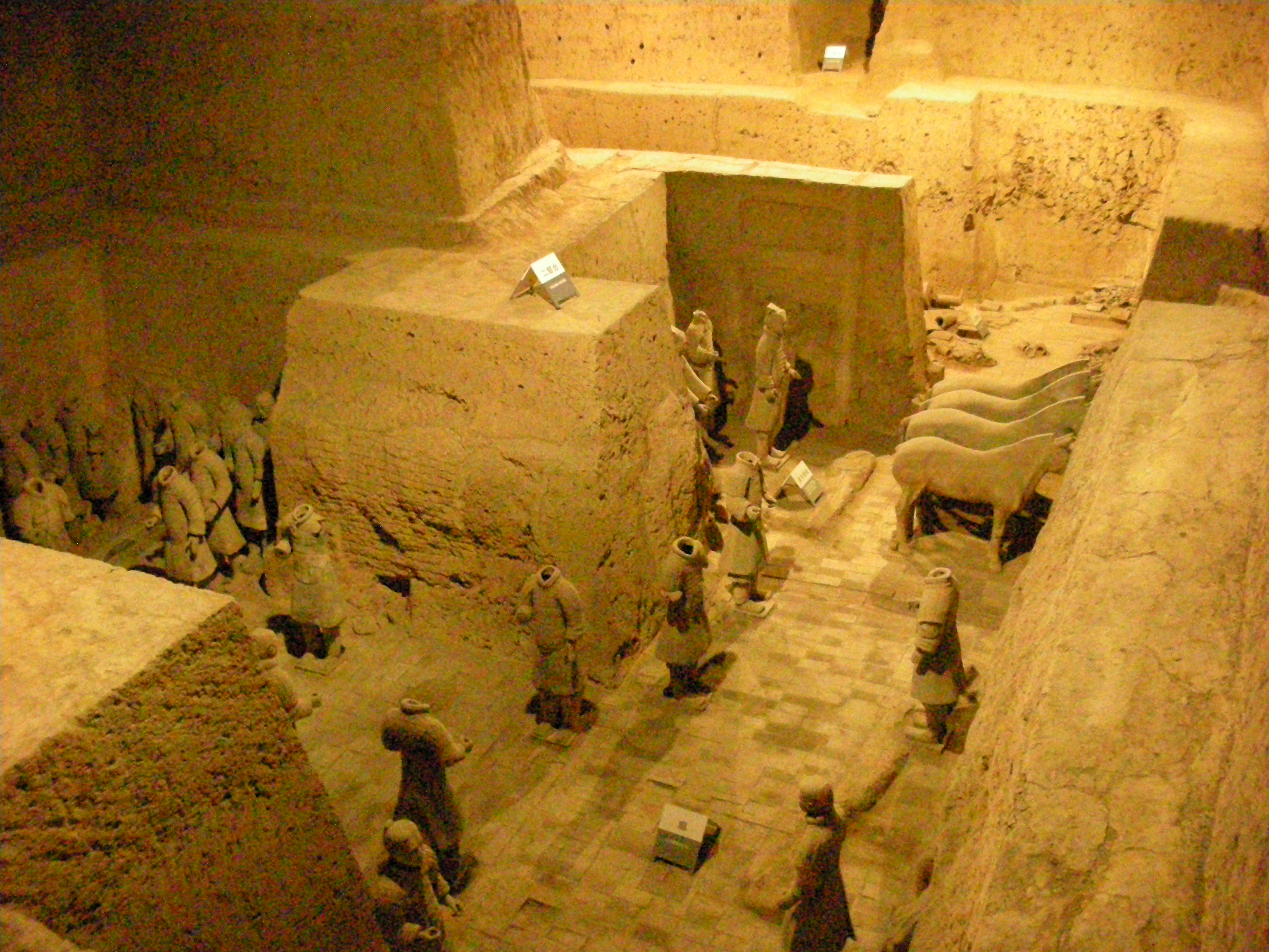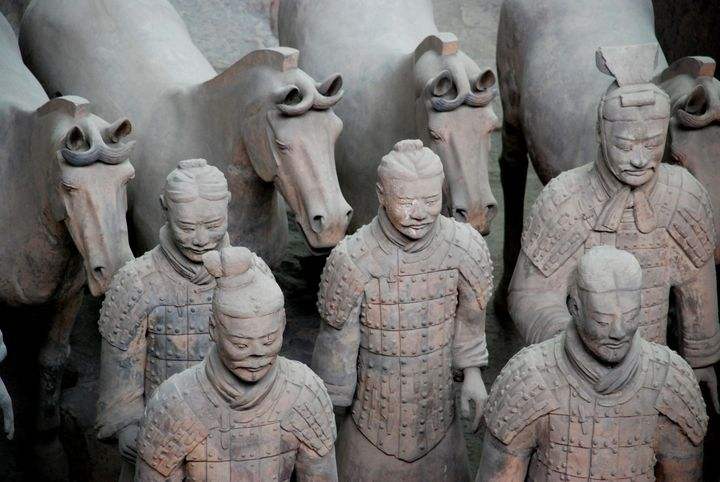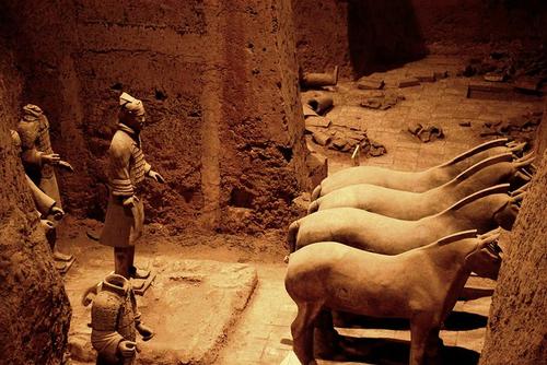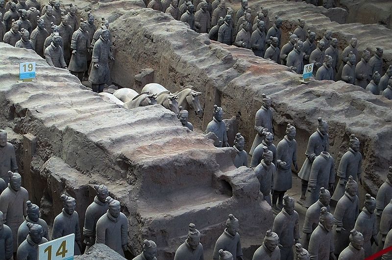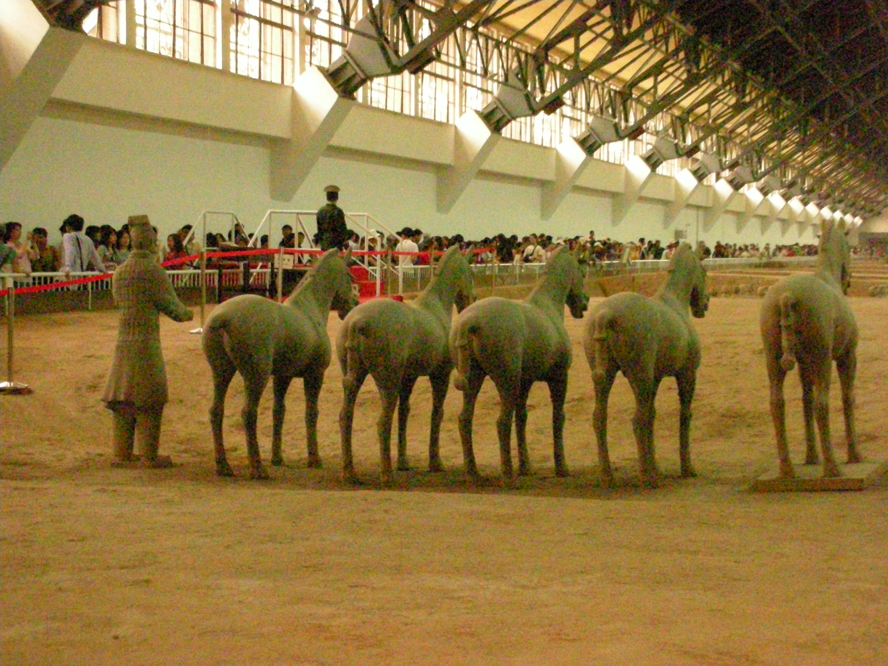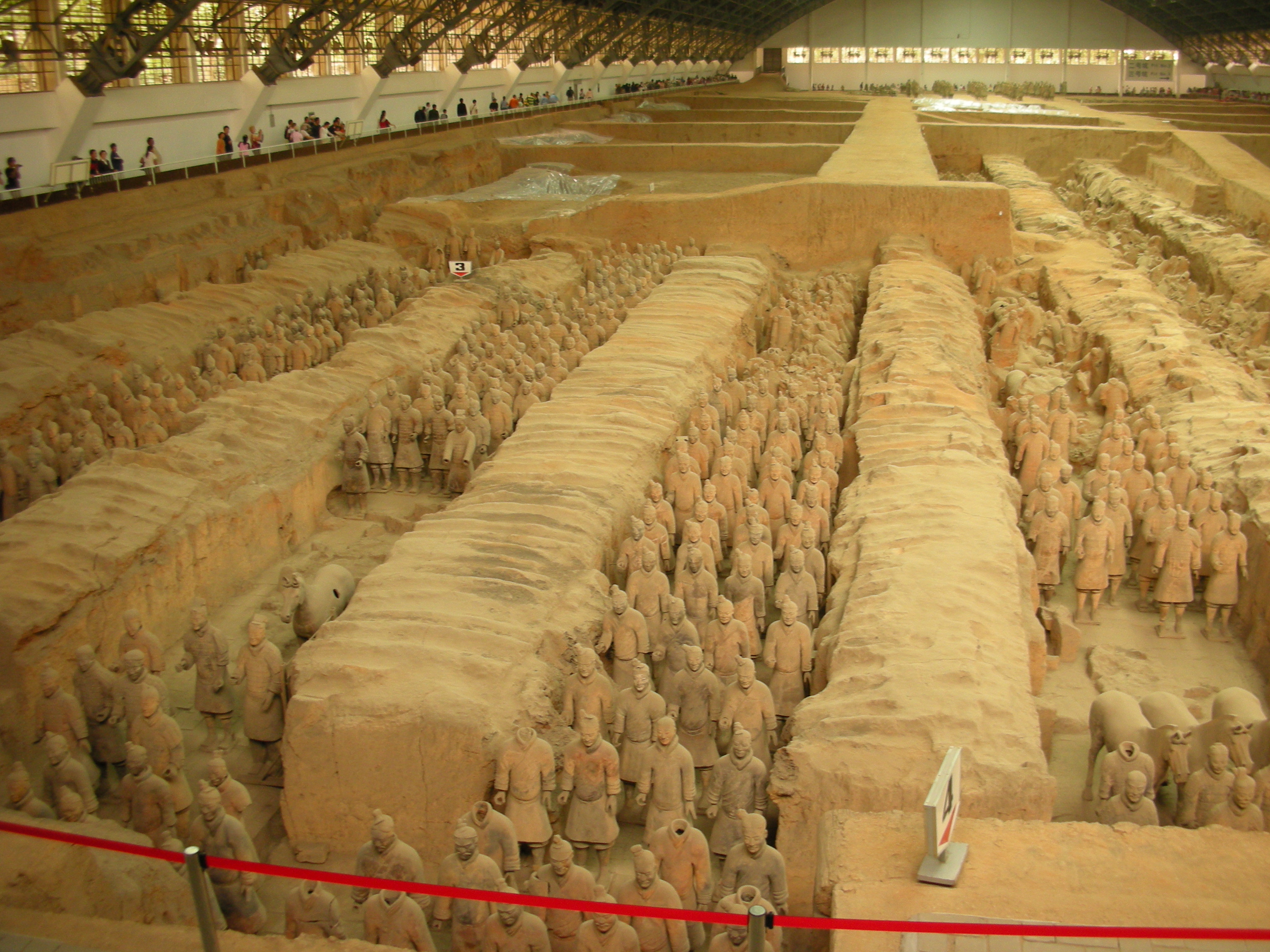 兵馬俑は秦の始皇帝陵の周囲に埋められている膨大な数の兵士や馬の人形です。「俑」とは副葬品として遺骸とともに埋葬された人形のことです。すべて異なる顔や姿をした人や馬の俑が約8千体発見され、当時の兵器も同じ場所から発見されました。兵士や軍馬だけでなく軍司令部のミニチュアや、文官や芸人等の俑もあったことから、生前の始皇帝の生活そのものを来世に持って行こうとしたものであるといわれています。 隊列は、東を向いており、当時の最大の外敵が東に存在していたからだと考えられます。