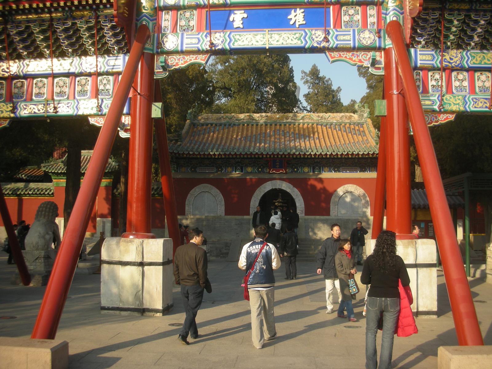 (永安橋を渡って瓊華島。正面、白塔。その前の永安寺というお寺の門。)