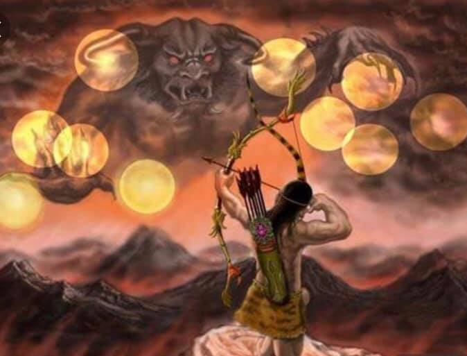 天帝である帝氓ノは羲和という妻がおり、その間に太陽となる10人の息子(火烏)を産んだ。この10の太陽は交代で1日に1人ずつ地上を照らす役目を負っていた。ところが帝堯の時代に、10の太陽がいっぺんに現れるようになった。地上は灼熱地獄のような有様となり、作物も全て枯れてしまった。このことに困惑した帝堯に対して、天帝である帝氓ヘその解決の助けとなるよう天から神の一人である?をつかわした。帝氓ヘ后?に紅色の弓(?弓)と白羽の矢を与えた。后?は、帝堯を助け、初めは威嚇によって太陽たちを元のように交代で出てくるようにしようとしたが効果がなかった。そこで仕方なく、1つを残して9の太陽を射落とした。これにより地上は再び元の平穏を取り戻したとされる。