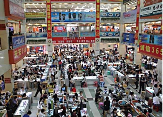 華強北は、深セン中心部の福田区の一角を占めるエリアのことです。もともとは日本の秋葉原を模してつくられましたが、いまやその秋葉原の30倍という世界最大の電子商店街となっています。