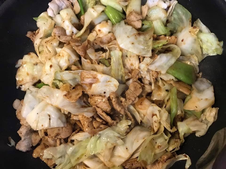 4、キャベツに火が通ったら、調味料をもう一度混ぜて、全体に絡め、皿に盛って出来上がり。